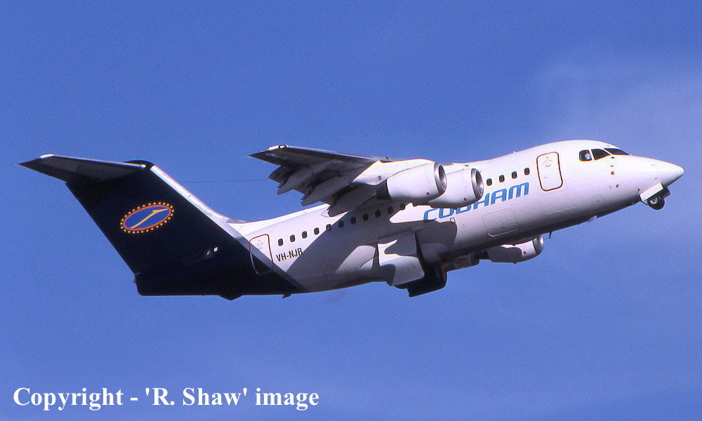 On This Day - May 07, 2015. The Cobham Aviation British Aerospace BAe146-100 VH-NJR, having been repainted into the airline's livery at Townsville (Queensland) by Flying Colours, was ferried from Townsville to Adelaide (West Beach) as Flight JTE500 to undergo a 'C-check' before it returned to service. This aircraft was the airline's second BAe146 to be repainted. |