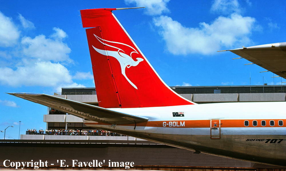 On This Day - November 09, 1975. The ex Qantas Airways Boeing 707-338C VH-EAI, having been sold to British Caledonian the previous day and reregistered as G-BDLM, departed Sydney (Kingsford Smith) on its ferry flight to Hong Kong where it was overhaulled and repainted. |