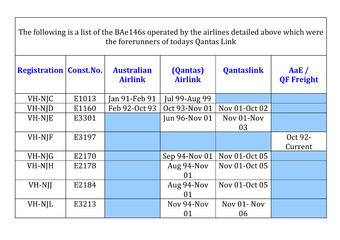 The operation of the British Aerospace BAe146 aircraft type by the ‘Qantas’ related companies dates back to January 1991 when Australian Airlines (formerly Trans-Australia Airlines) employed the first aircraft under the ‘Australian AirLink’ name. They had a requirement for a jet aircraft smaller than the Boeing 737 and teamed up with National Jet Systems, Adelaide, to operate this new type on their behalf. When Australian Airlines was purchased by Qantas in October 1993, the name ‘Australian Airlink’ was simplified to ‘Airlink’ and all the four Australian Airlink aircraft were repainted into the Qantas livery. Airlink (with all the aircraft operated by National Jet Systems on behalf of Qantas), gradually added more BAe146s building up a substantial fleet. Airlink operated under that name until late 2001 when once again it underwent a change of identity to 'Qantaslink'. This was done to coincide the introduction of the Boeing 717 fleet at the same time, which eventually replaced the entire BAe146 fleet. The Boeing 717 fleet remains operated by Cobham Aviation Services which was formerly National Jet Systems. The only BAe146s initially operated independently were VH-YAD, VH-YAE and VH-YAF which were part of the fleet of Southern Australia Airlines and remained that way until Southern Australian was closed down in September 2002. The three BAe146 aircraft that operated for Australian Air Express (which was originally set up as a joint venture between Australian Airlines and Australia Post) became part of the StarTrack / Qantas Freight operation (which was a joint venture between Qantas Freight and StarTrack Express) from 2013. StarTrack Express is now a wholly owned subsidiary of Australia Post.