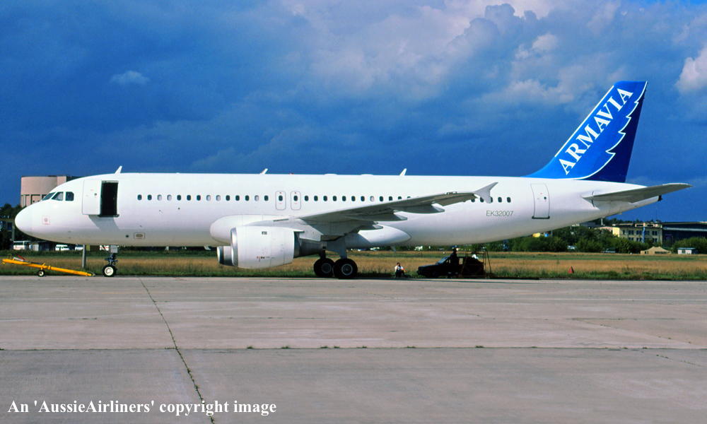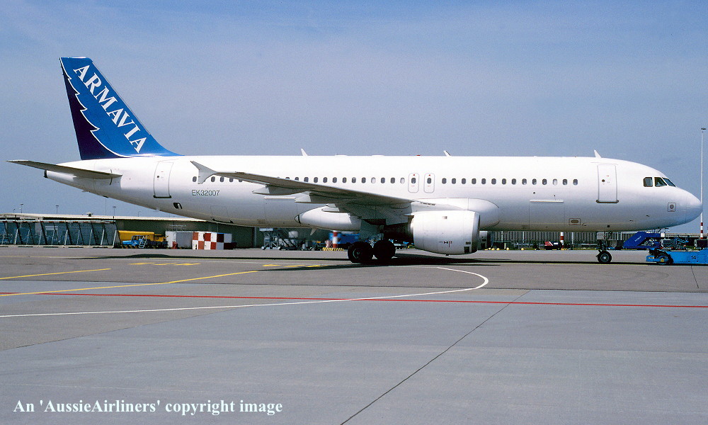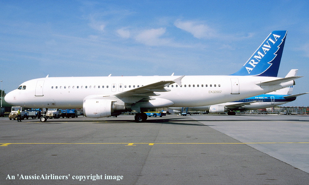 EK-32007. Armavia - in the original livery at Amsterdam Schiphol Airport, August 2003. (R. N. Smith Collection Copyright Image 0320-007.) |