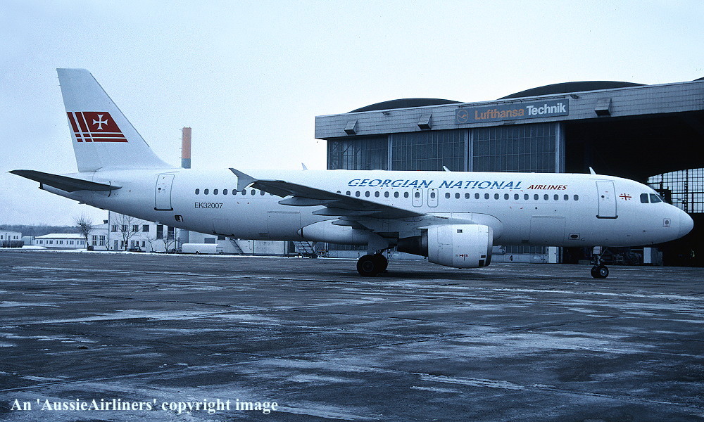 EK-32007. Georgian National Airlines - in the all-white livery at Berlin Schonefeld Airport, March 2005. (R. N. Smith Collection Copyright Image 0320-057.) |