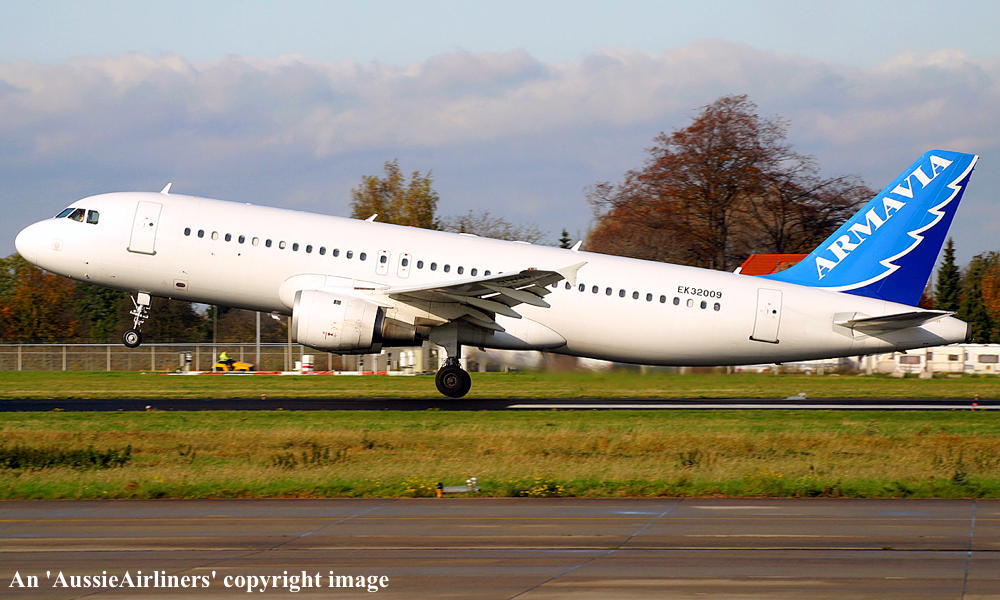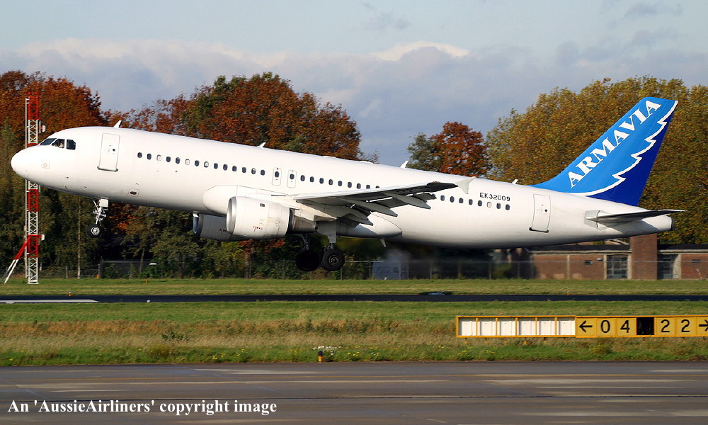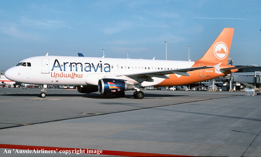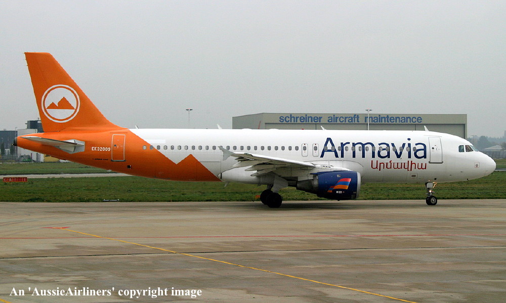 EK-32009. Armavia - in the revised livery at Amsterdam Schiphol Airport, November 2004. (R. N. Smith Collection Copyright Image 0320-031.) |