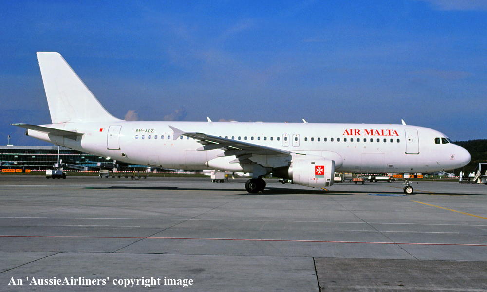 9H-ADZ. Air Malta - in the 'all-white' livery at an unknown airport, October 2002. (R. N. Smith Collection Copyright Image 0321-211.) |