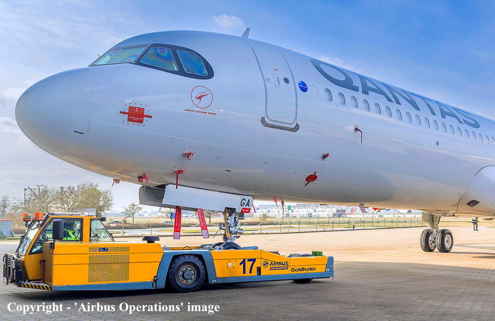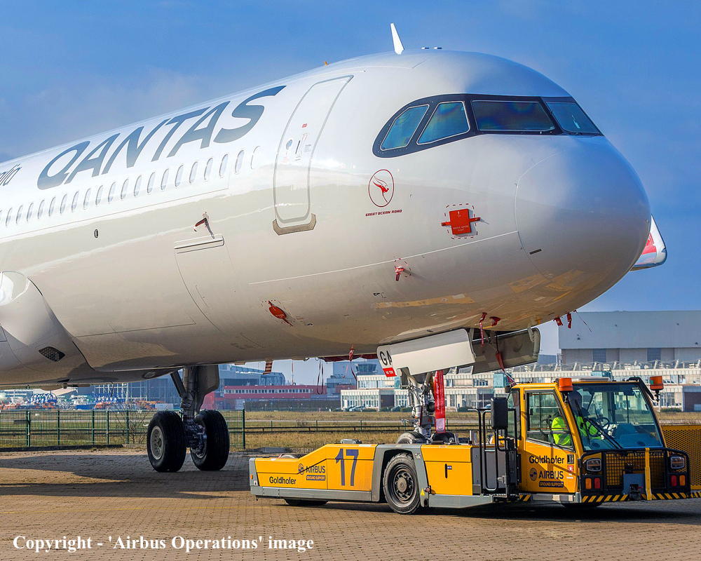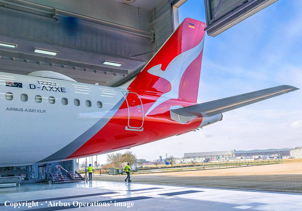 D-AXXE. Qantas Spirit of Australia - 'Great Ocean Road' at the Airbus plant at Hamburg Finkenwerder Airport, February 2025. (Airbus Operations GmbH Copyright Image 0321-666.) |