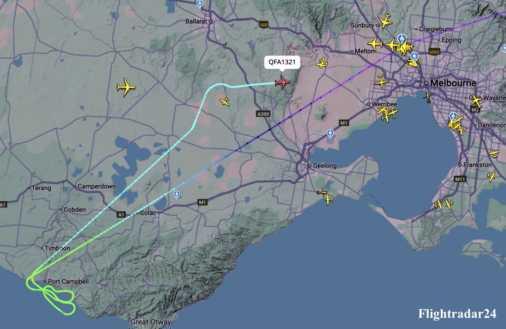 VH-OGA. Qantas Spirit of Australia - 'Great Ocean Road' first flight tracking over Melbourne, September 25, 2025. (Flightradar24 Image 0321-685.) |