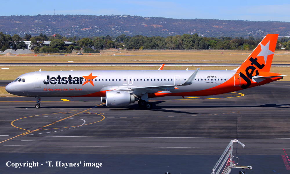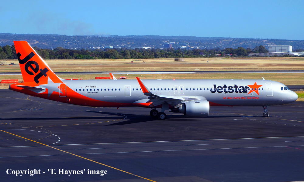 VH-OYR. Jetstar - in the revised livery at Adelaide West Beach Airport, March 23, 2025. (T. Haynes Copyright Image 0321-632.) |