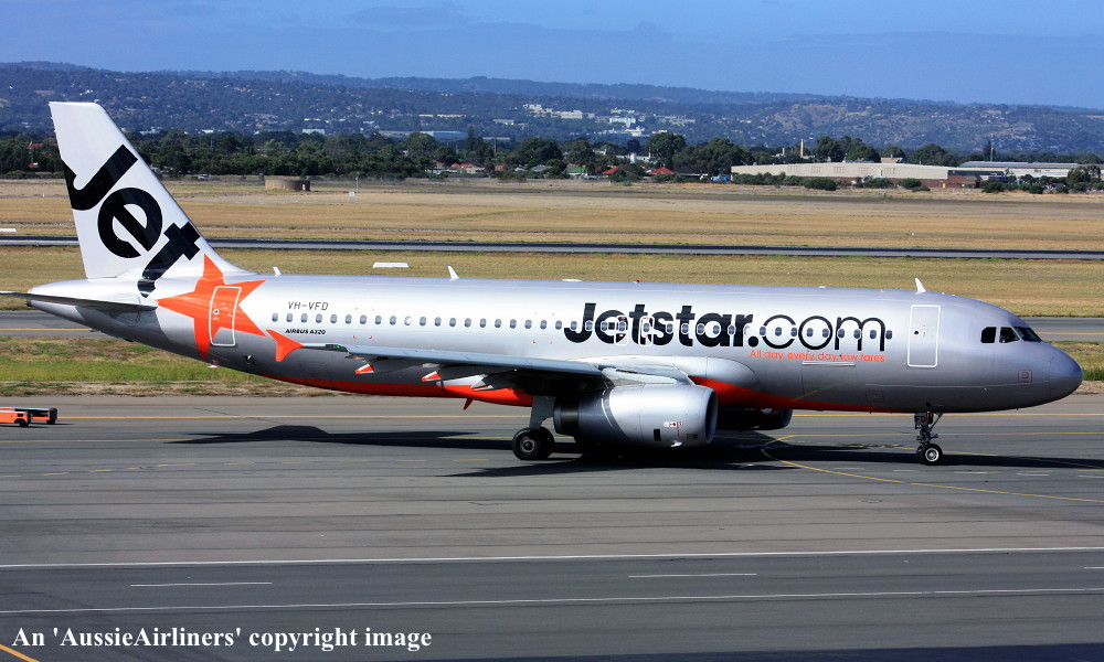 VH-VFD. Jetstar - in the standard livery at Adelaide West Beach Airport, January 25, 2016. (T. Haynes Copyright Image 0320-557.) |