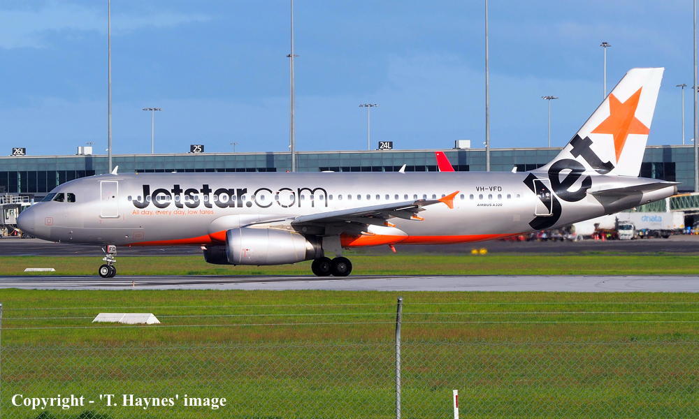 VH-VFD. Jetstar - in the standard livery at Christchurch Airport, May 31, 2015. (Z. Rae Copyright Image 0320-723.) |