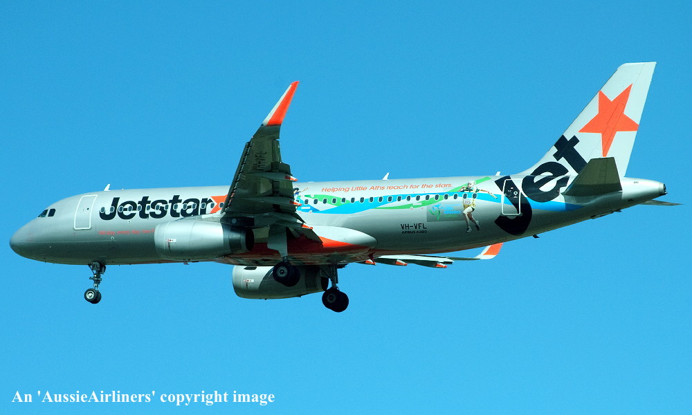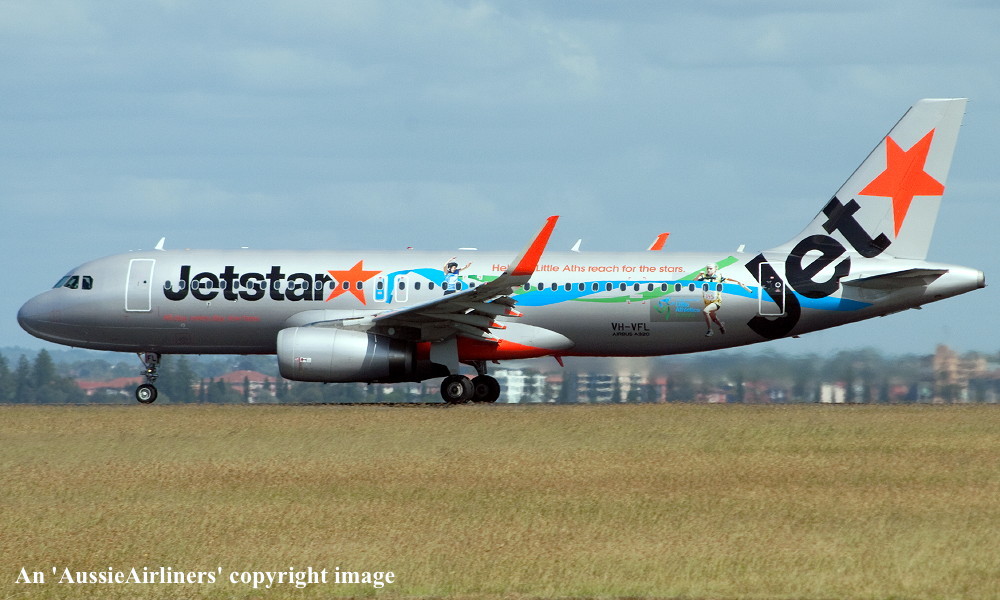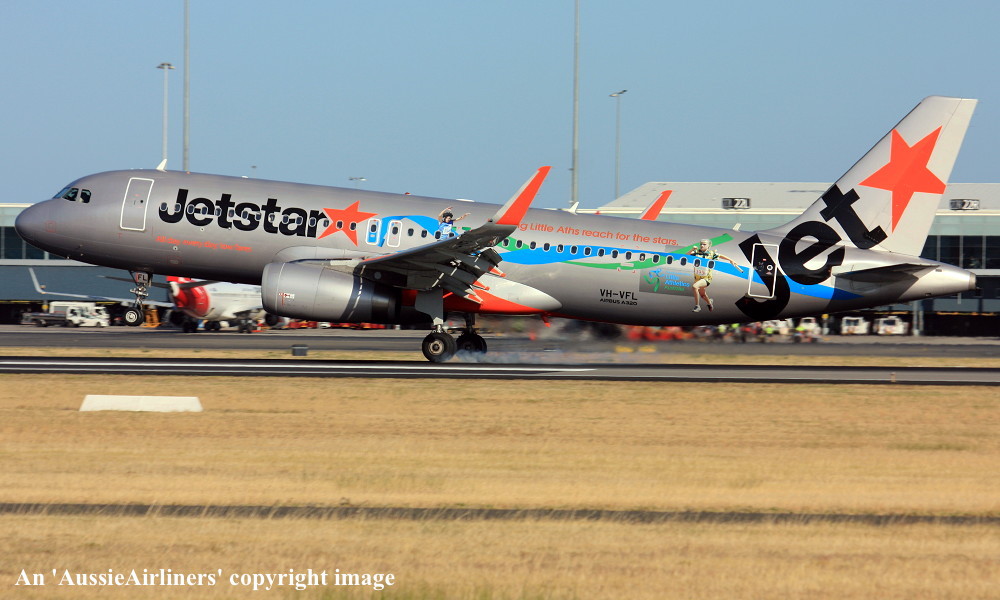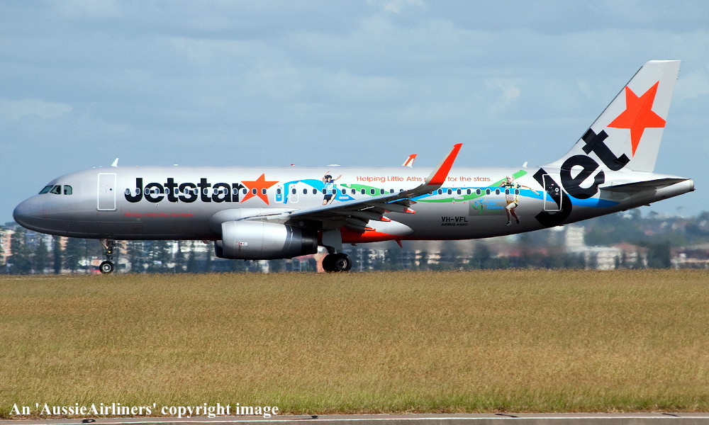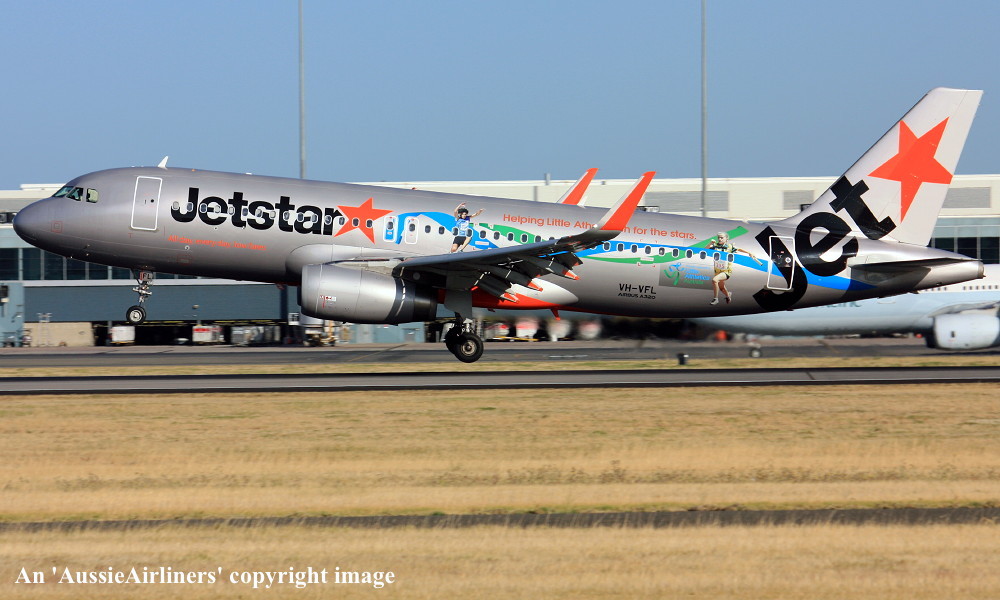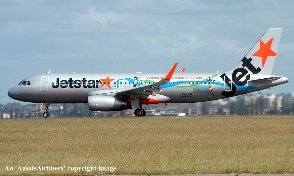 VH-VFL. Jetstar - in the standard livery with additional 'Helping Little Aths Reach For The Stars' decals at Sydney Kingsford Smith Airport, March 25, 2015. (G. Louis Copyright Image 0320-499.) |