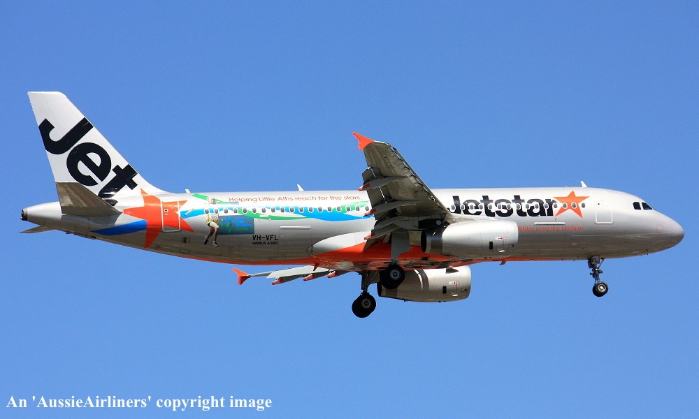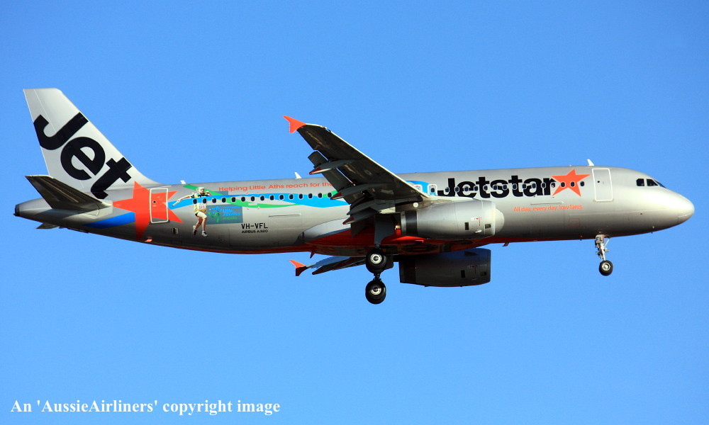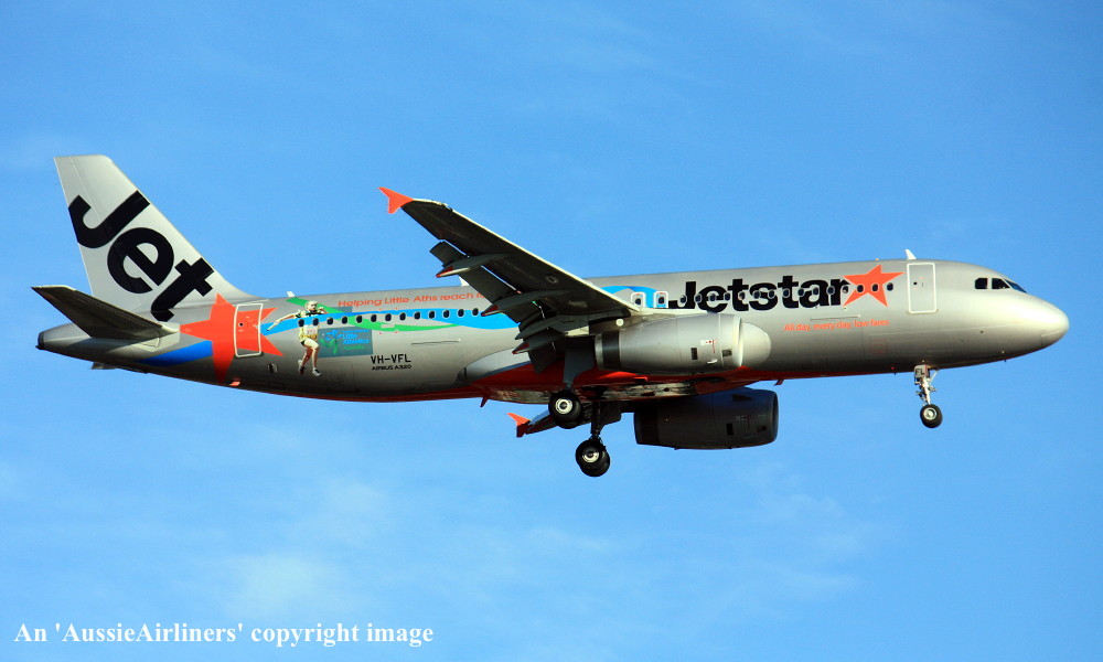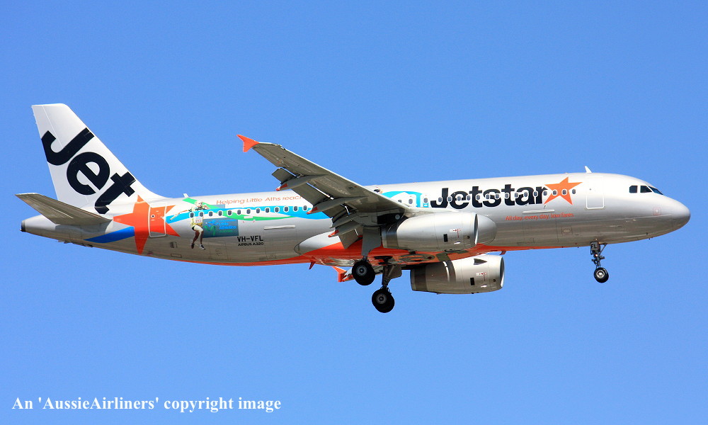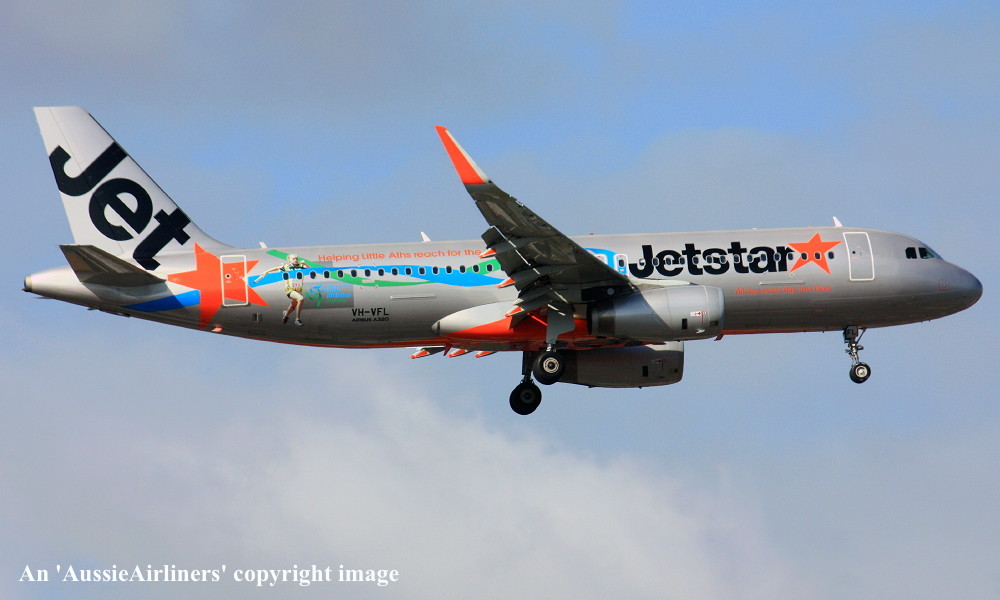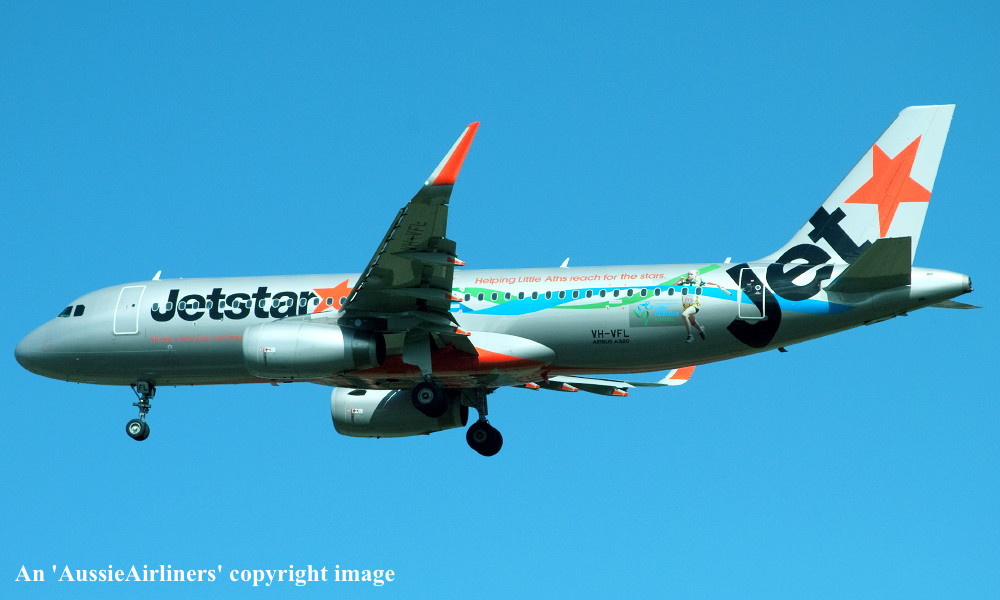 VH-VFL. Jetstar - in the standard livery with additional 'Helping Little Aths Reach For The Stars' decals at Sydney Kingsford Smith Airport, March 25, 2015. (G. Louis Copyright Image 0320-499.) |