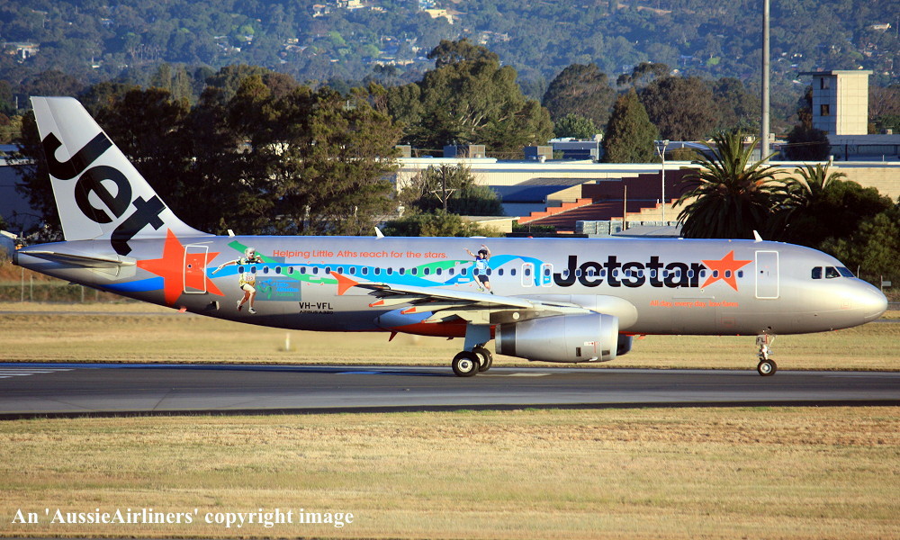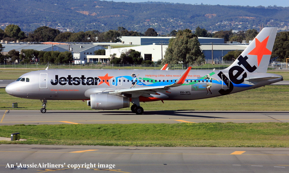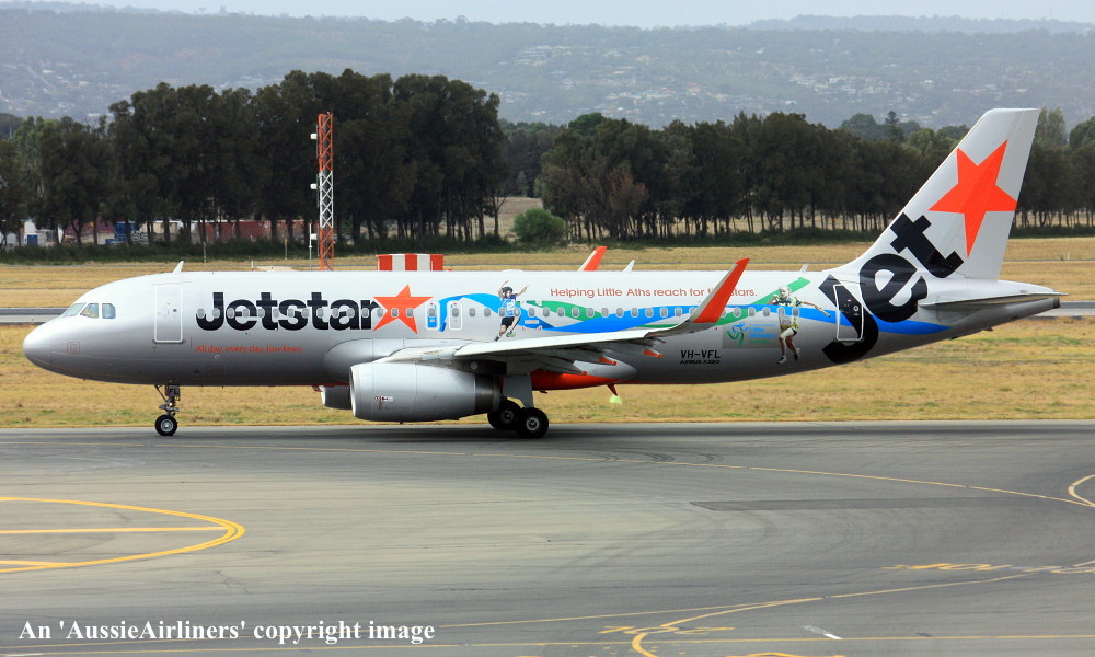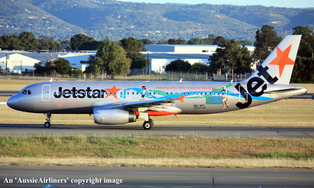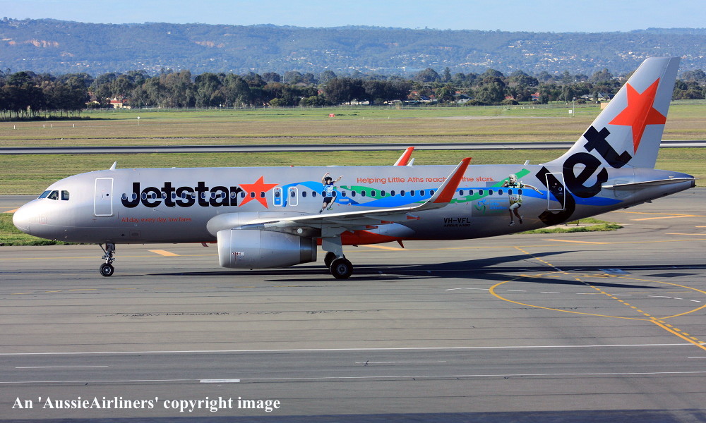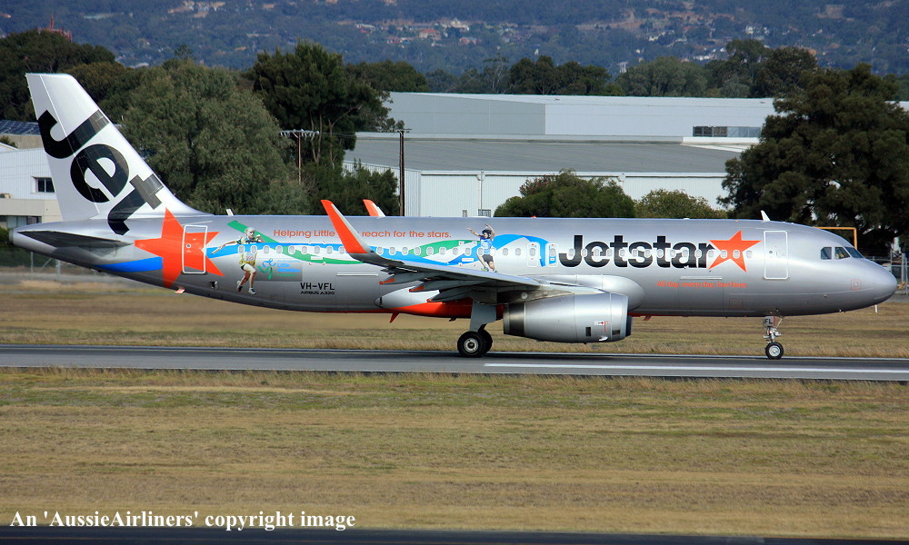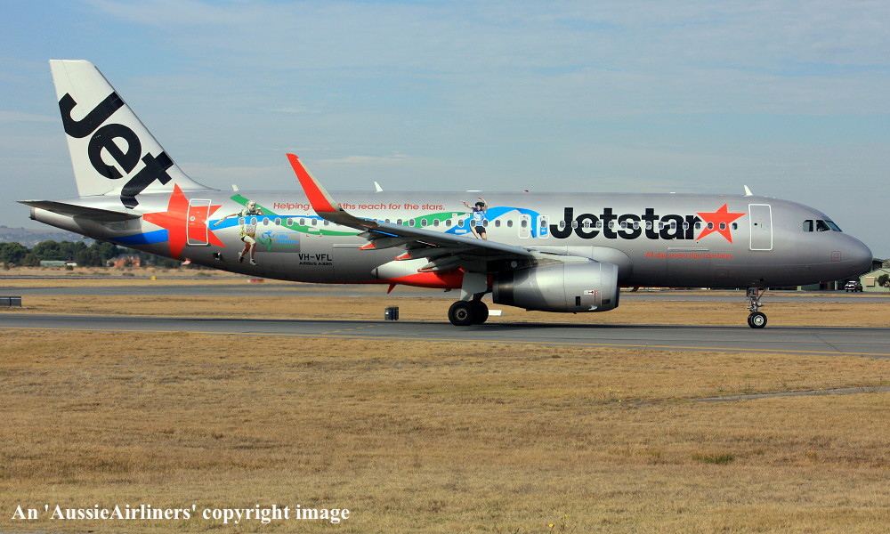 VH-VFL. Jetstar - in the standard livery with additional 'Helping Little Aths Reach For The Stars' decals at Adelaide West Beach Airport, October 25, 2014. (T. Haynes Copyright Image 0320-449.) |
