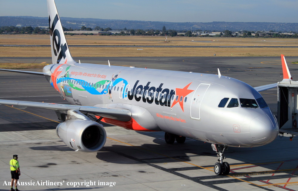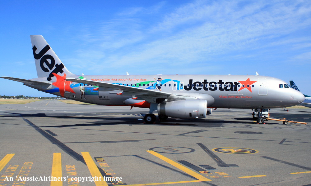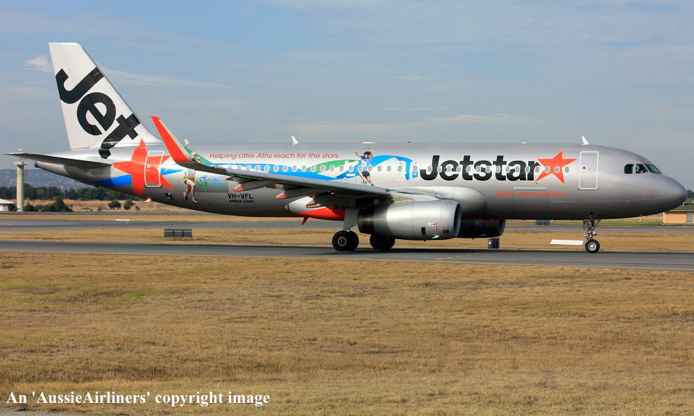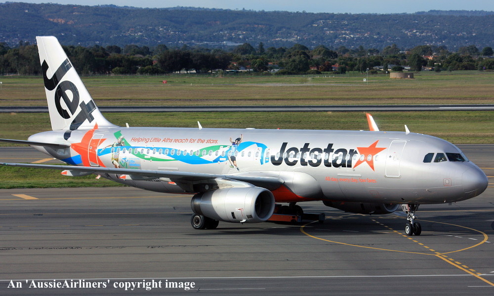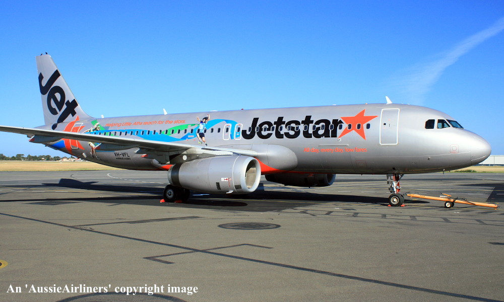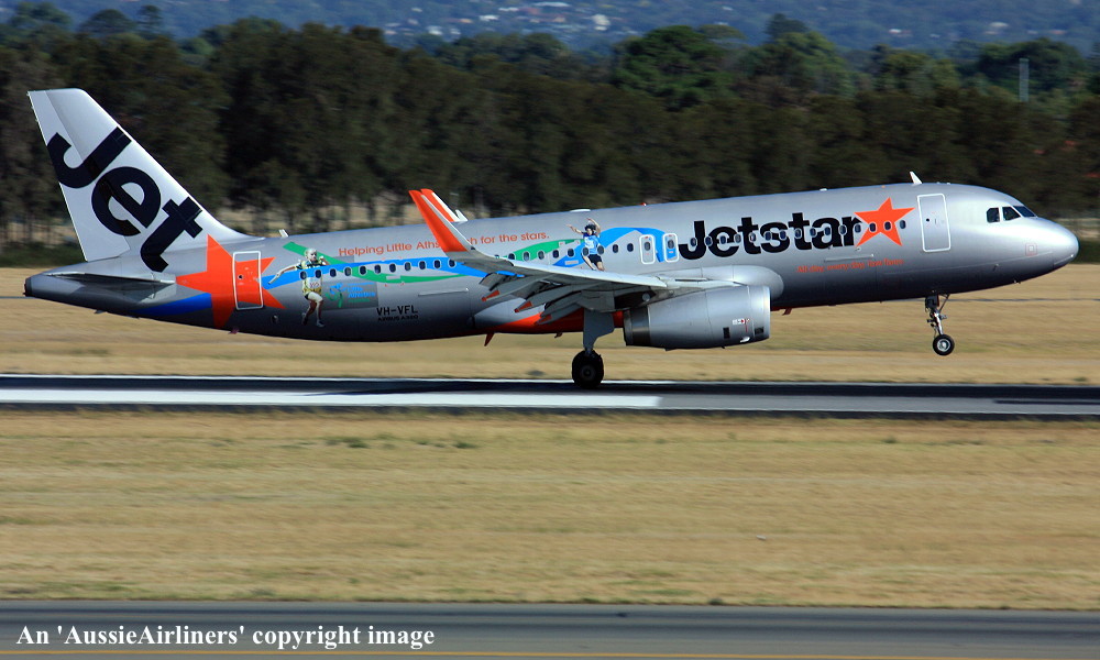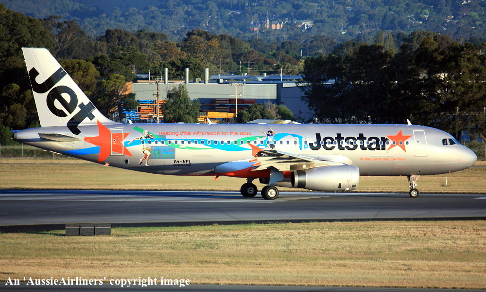 VH-VFL. Jetstar - in the standard livery with additional 'Helping Little Aths Reach For The Stars' decals at Adelaide West Beach Airport, October 25, 2014. (T. Haynes Copyright Image 0320-449.) |