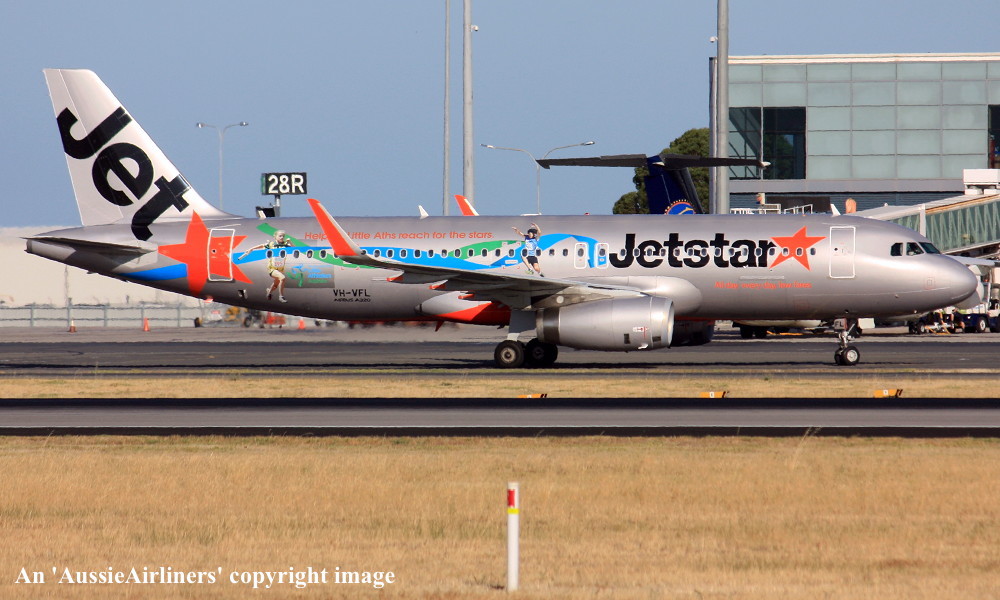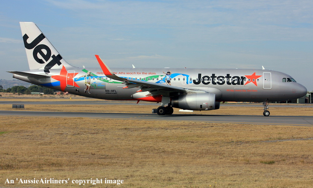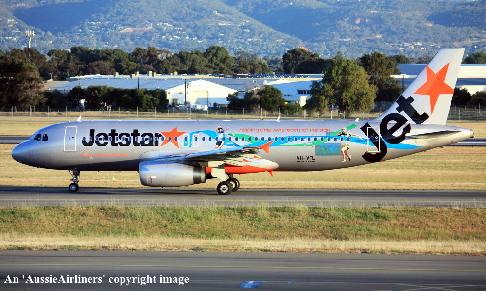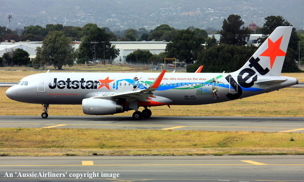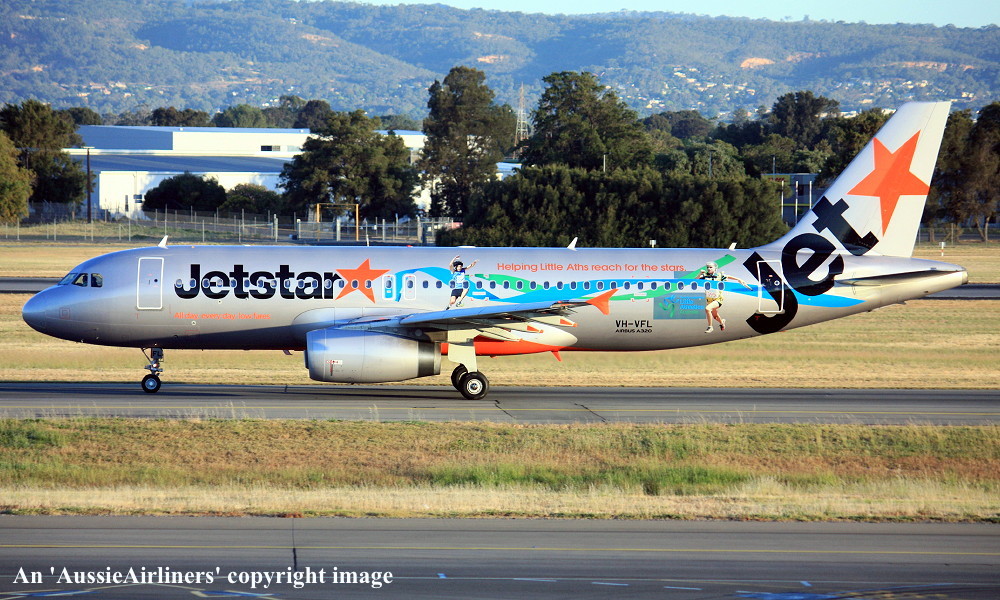 VH-VFL. Jetstar - in the standard livery with additional 'Helping Little Aths Reach For The Stars' decals at Adelaide West Beach Airport, October 25, 2014. (T. Haynes Copyright Image 0320-458.) |