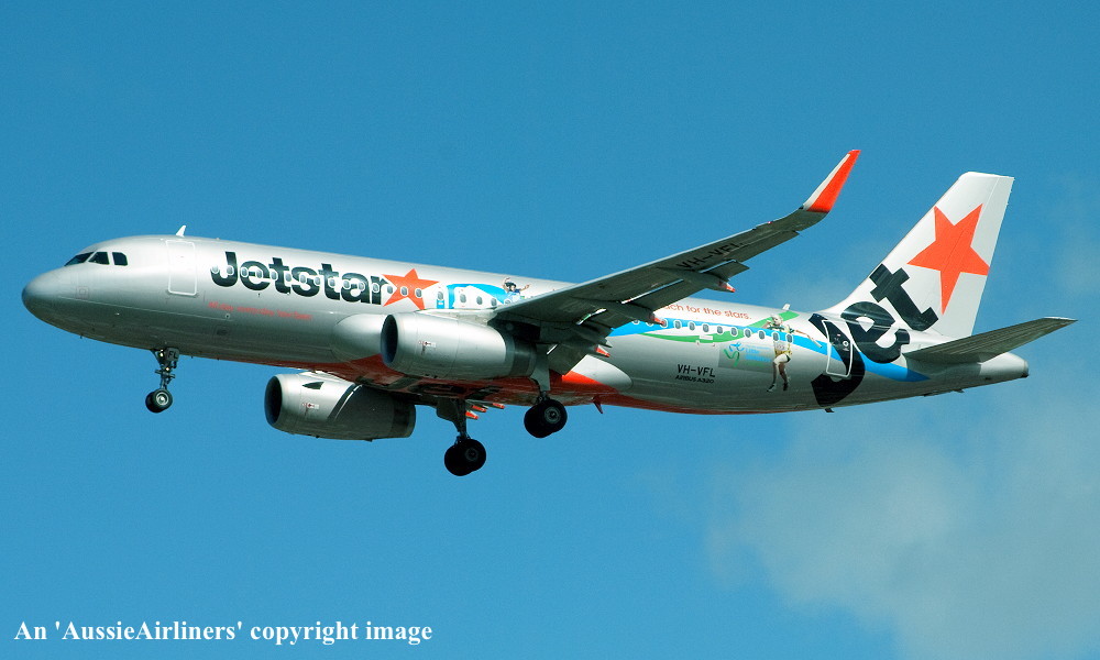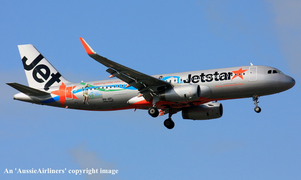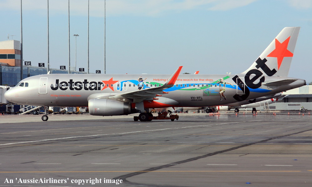 VH-VFL. Jetstar - in the standard livery with additional 'Helping Little Aths Reach For The Stars' decals at Sydney Kingsford Smith Airport, March 25, 2015. (G. Louis Copyright Image 0320-500.) |