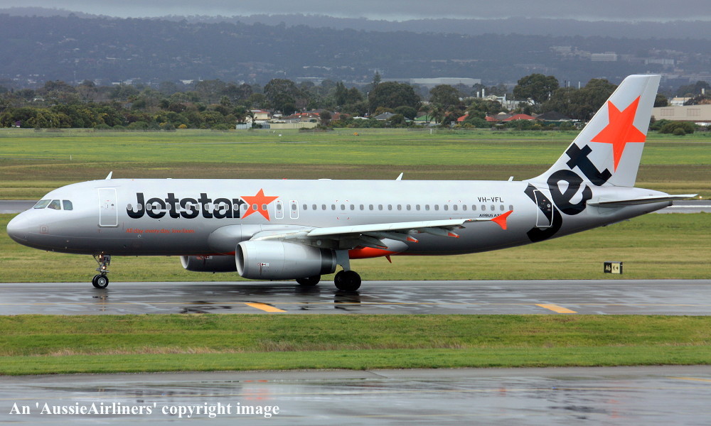 VH-VFL. Jetstar - in the standard livery at Adelaide West Beach Airport, August 22, 2013. (T. Haynes Copyright Image 0320-870.) |