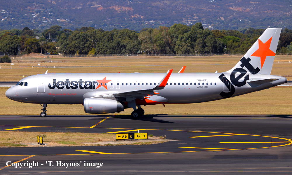 VH-VFL. Jetstar - in the standard livery at Adelaide West Beach Airport, March 23, 2025. (T. Haynes Copyright Image 0321-630.) |