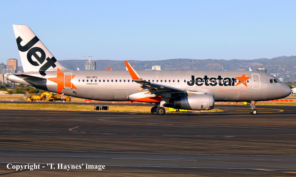 VH-VFL. Jetstar - in the standard livery at Adelaide West Beach Airport, August 24, 2017. (T. Haynes Copyright Image 0321-038.) |