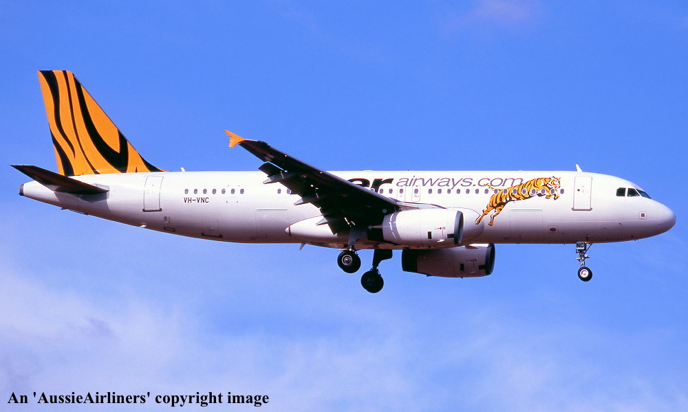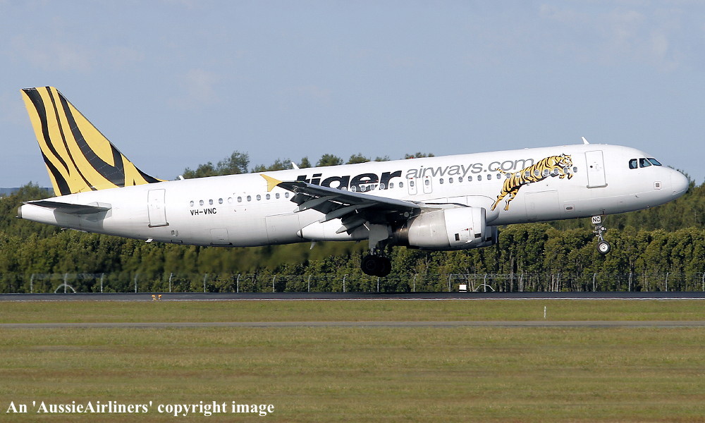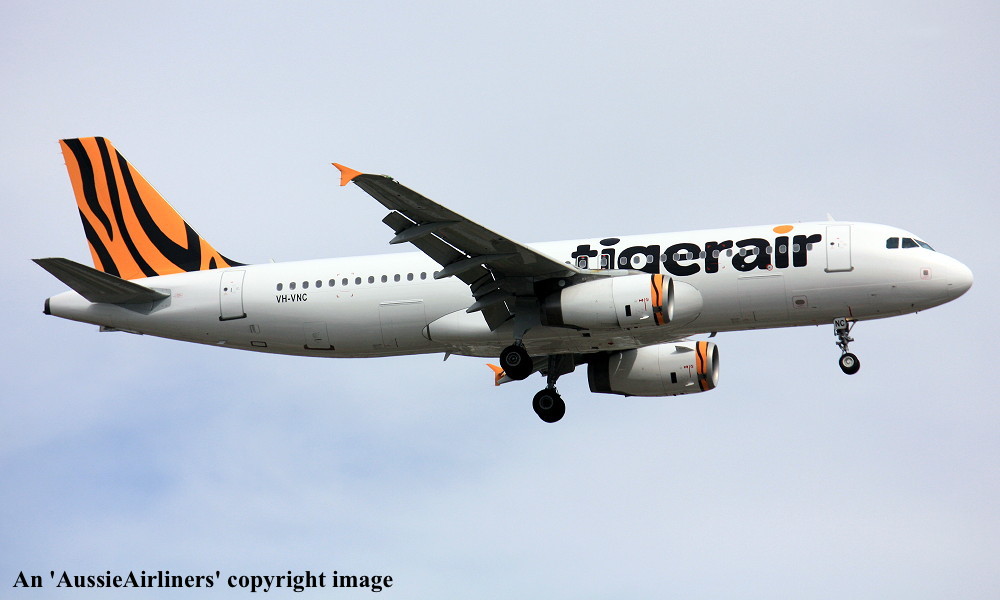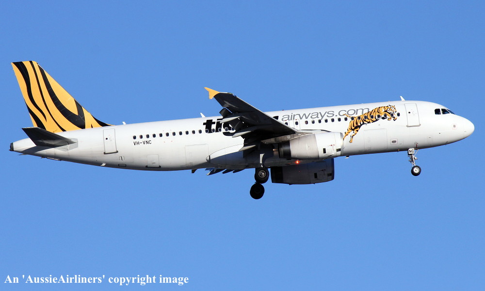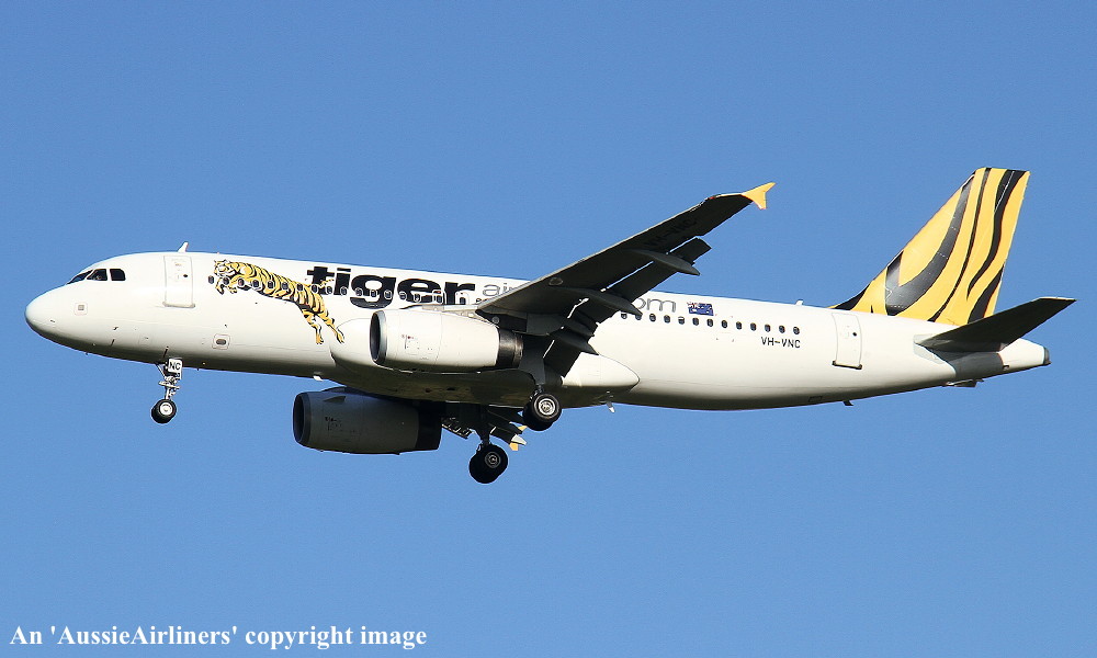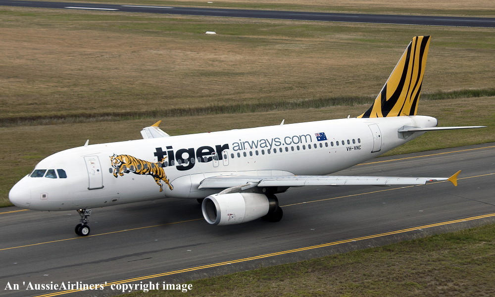 VH-VNC. Tiger Airways - in the standard livery at Brisbane Airport, April 21, 2012. (R. N. Smith Collection Copyright Image 0320-491.) |