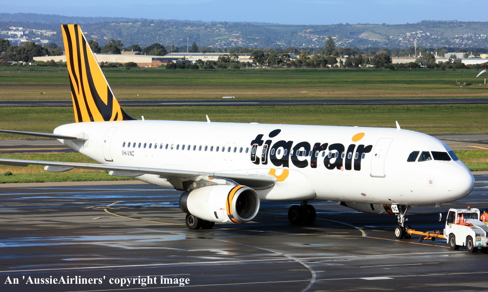 VH-VNC. Tiger Airways - in the standard livery at Adelaide West Beach Airport, July 10, 2014. (T. Haynes Copyright Image 0320-492.) |