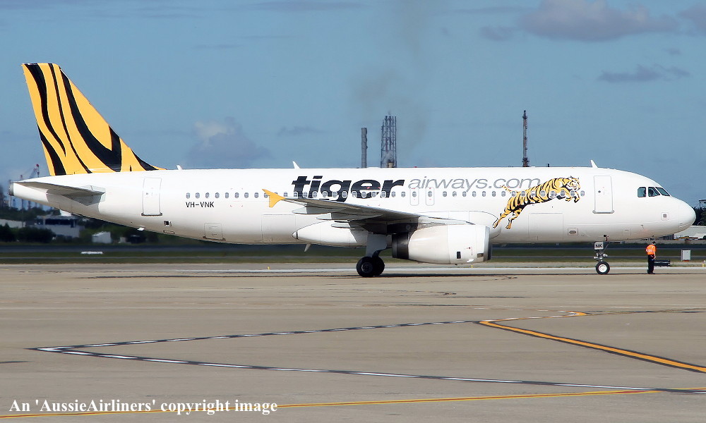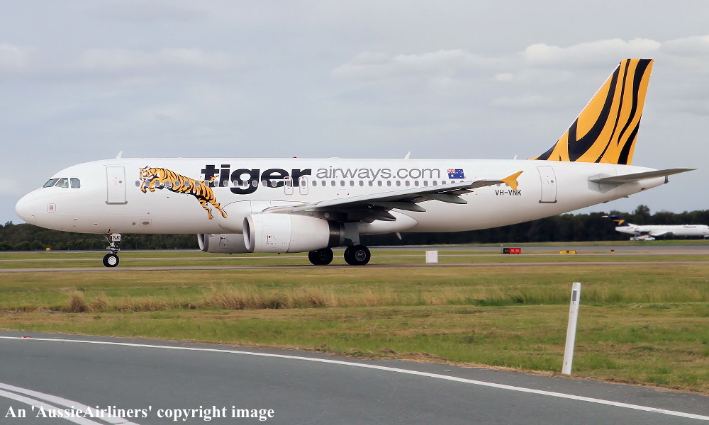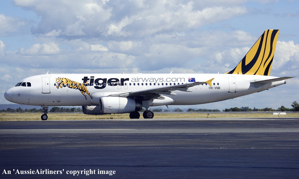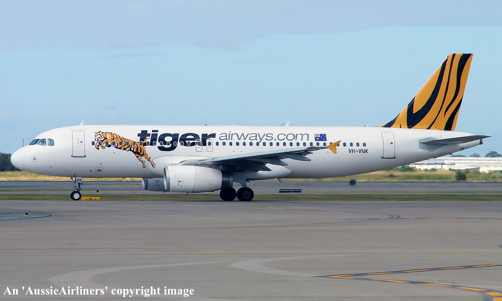 VH-VNK. Tiger Airways - in the standard livery at Brisbane Airport, June 2010. (R. N. Smith Collection Copyright Image 0320-177.) |