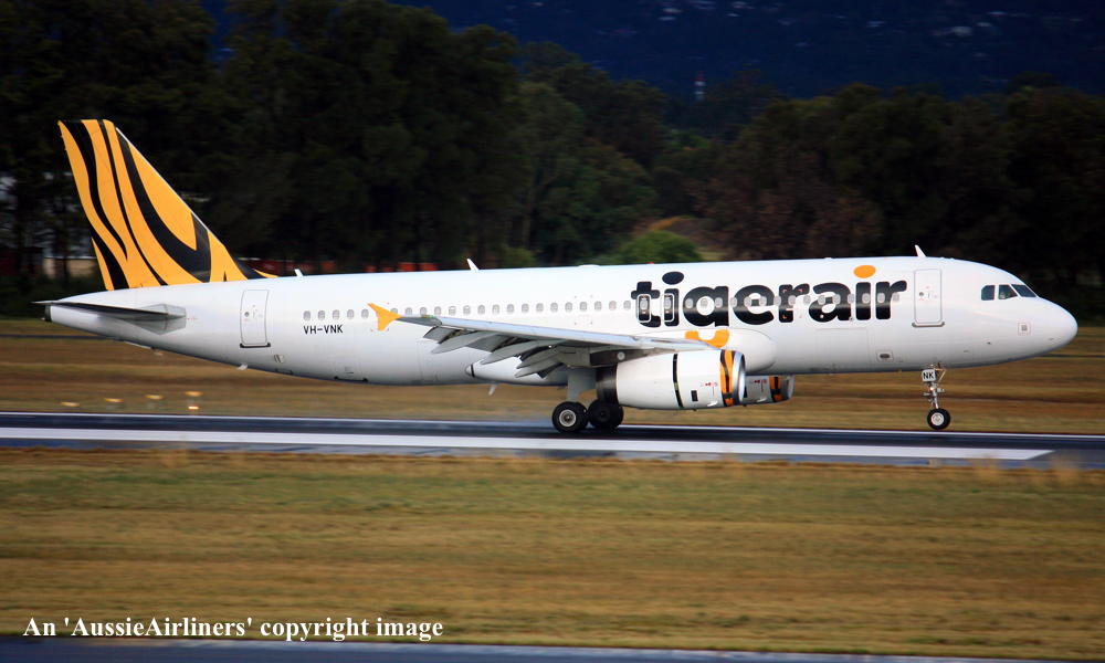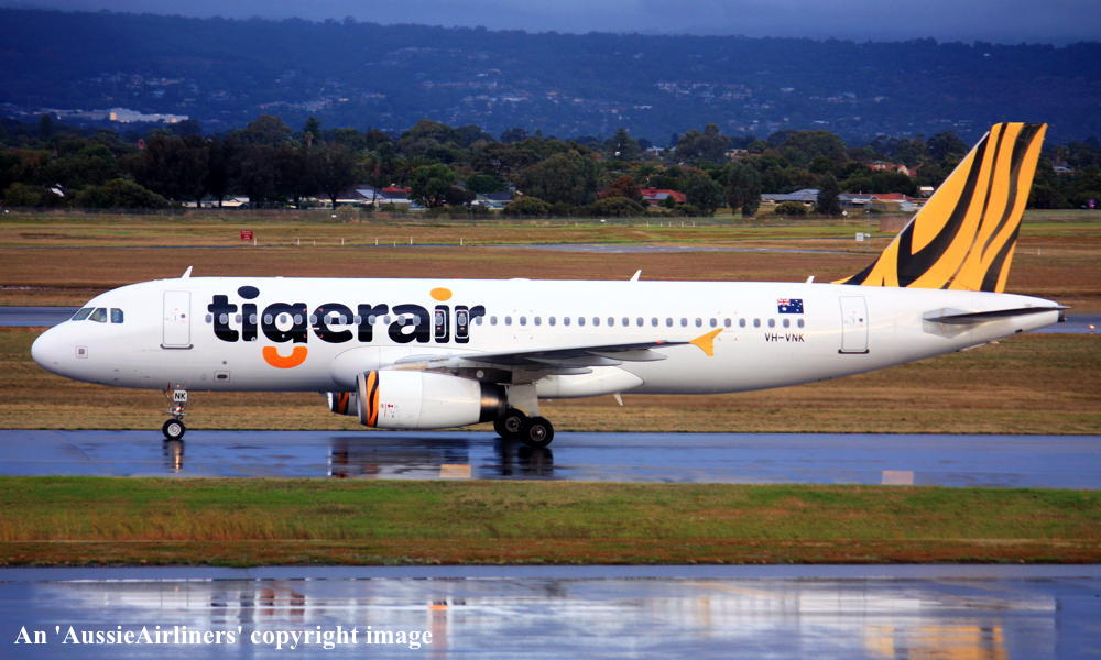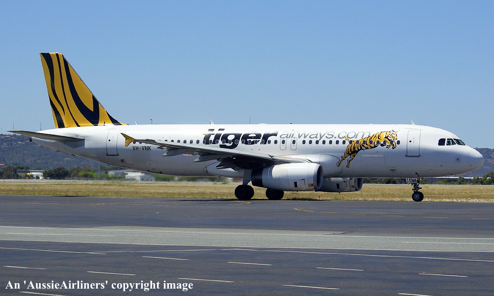 VH-VNK. Tiger Airways - in the standard livery at Perth Airport, December 16, 2011. (R. N. Smith Collection Copyright Image 0320-651.) |