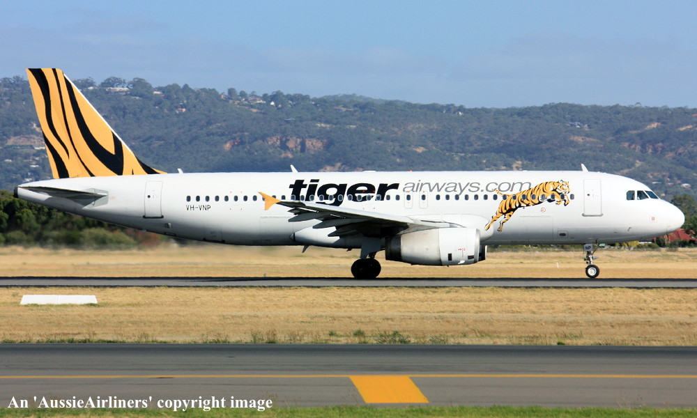 VH-VNP. Tiger Airways - in the standard livery at Adelaide West Beach Airport, January 10, 2014. (T. Haynes Copyright Image 0320-430.) |
