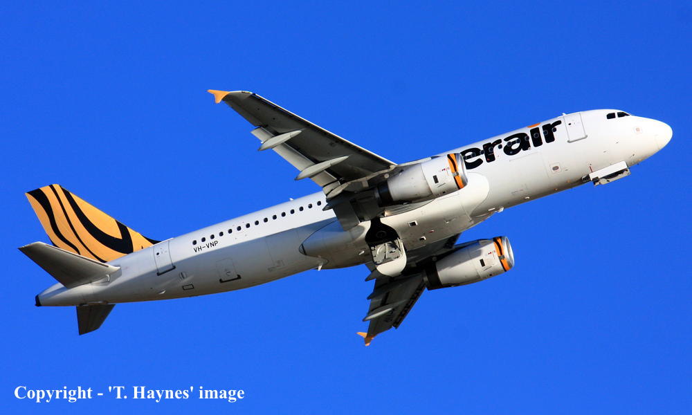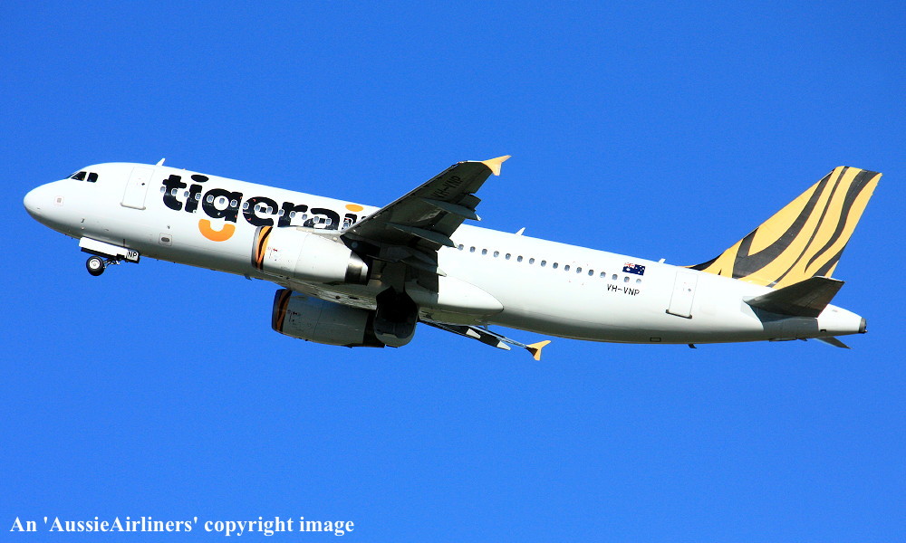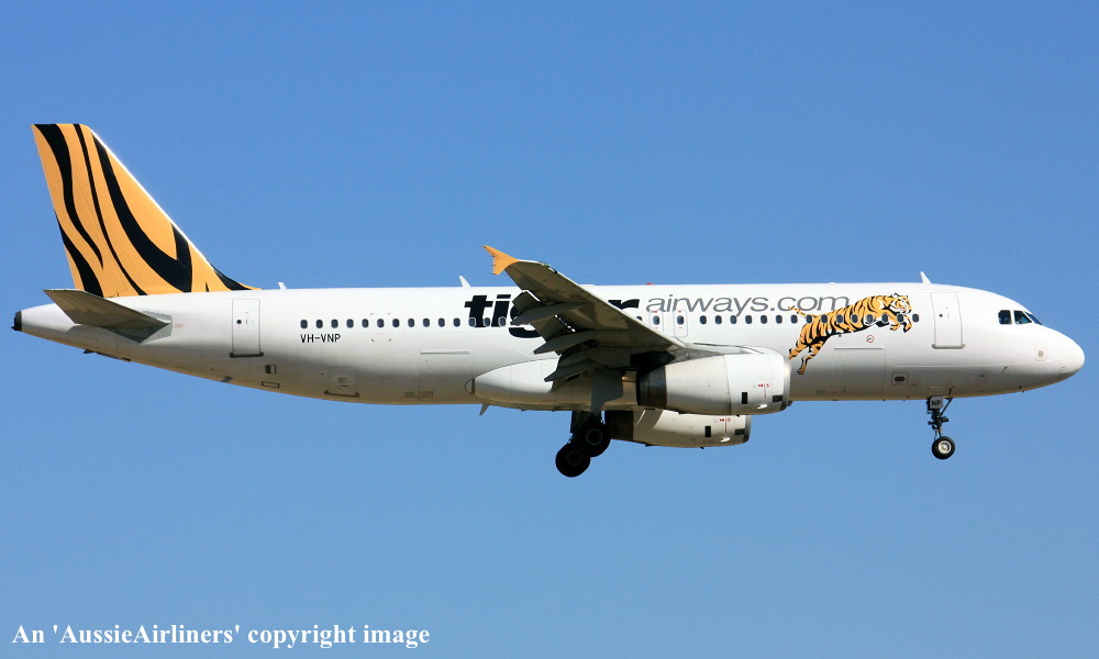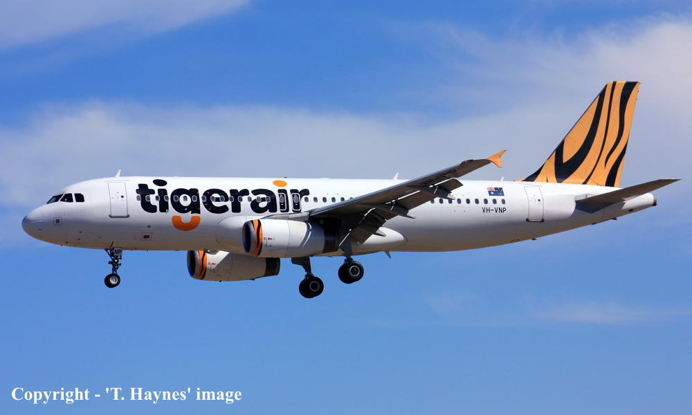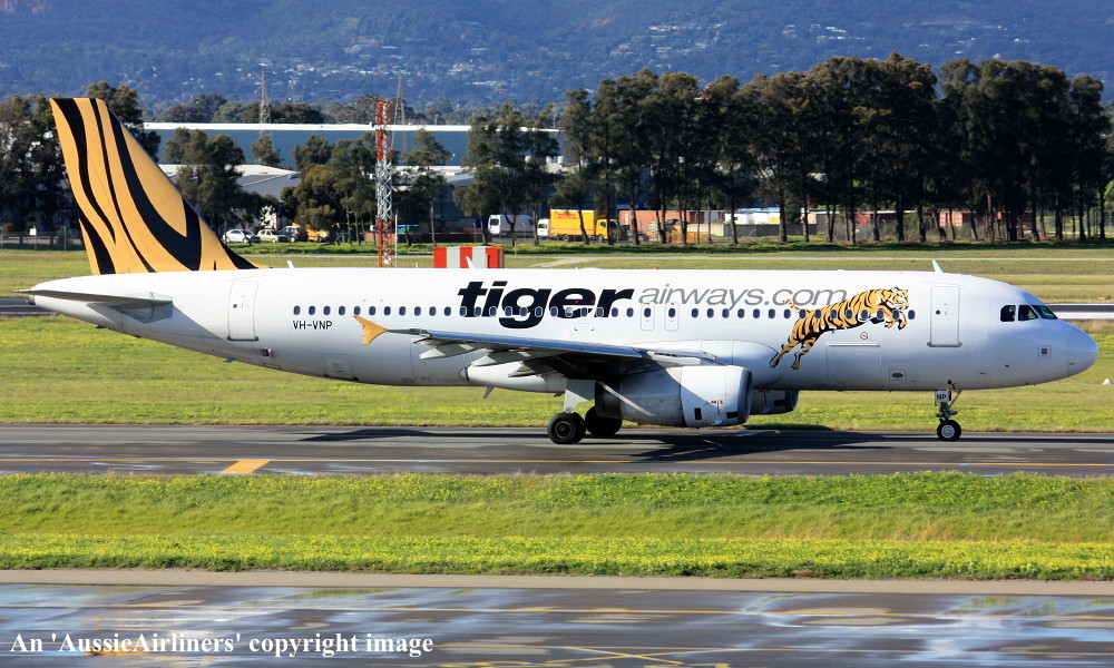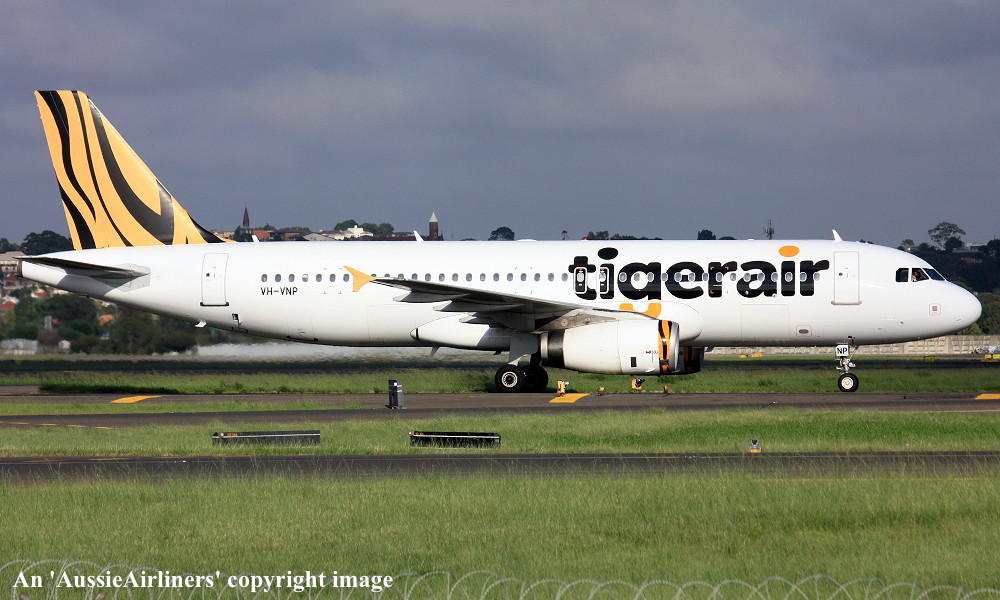 VH-VNP. Tigerair - in the standard livery at Sydney Kingsford Smith Airport, January 29, 2016. (T. Haynes Copyright Image 0320-560.) |