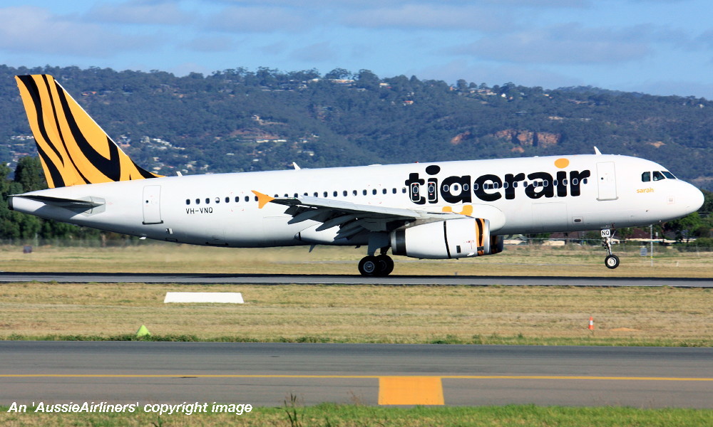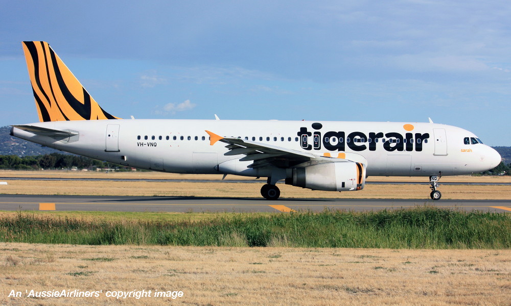 VH-VNQ. Tigerair - 'Sarah' in the standard livery at Adelaide West Beach Airport, February 22, 2014. (T. Haynes Copyright Image 0320-671.) |