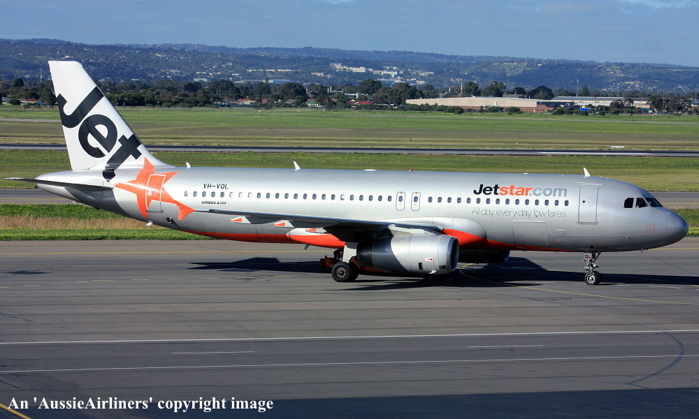 VH-VQL. Jetstar - in the original livery at Adelaide West Beach Airport, July 24, 2013. (T. Haynes Copyright Image 0320-360.) |