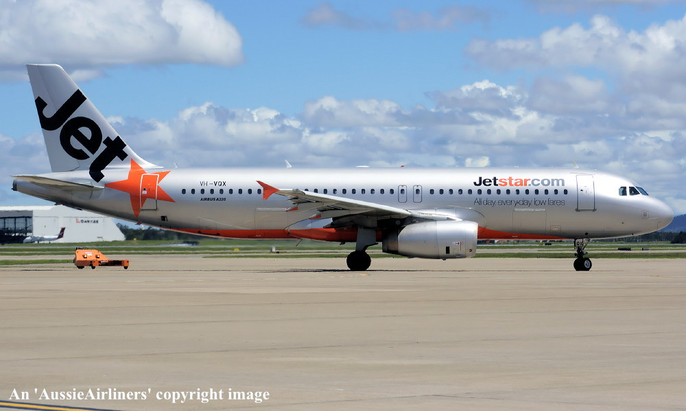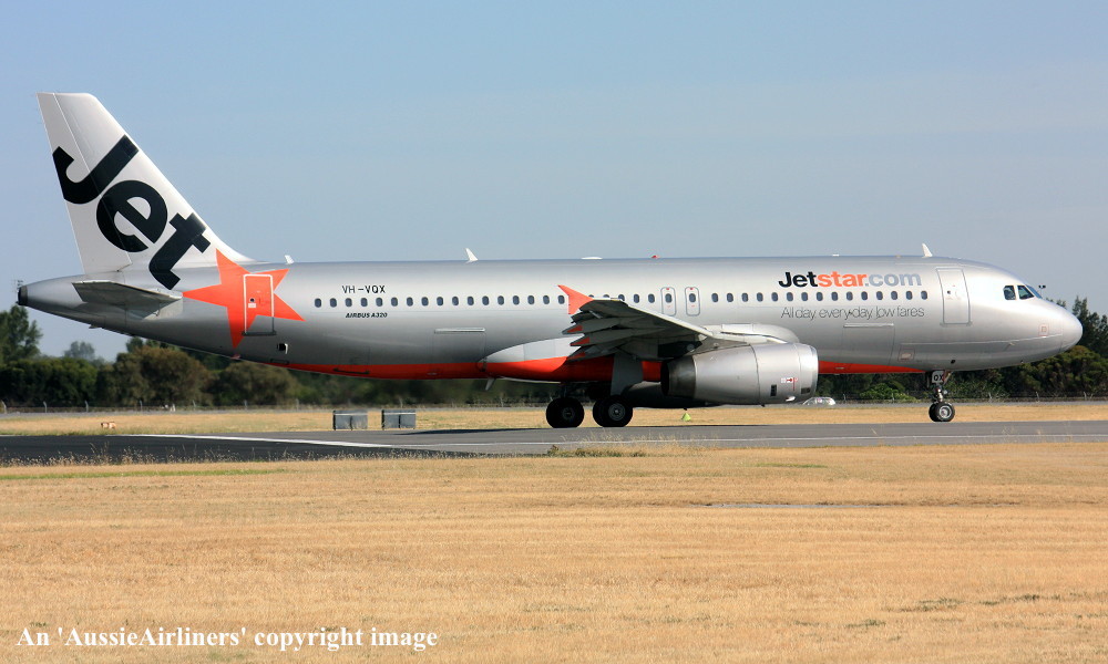 VH-VQX. Jetstar - in the original livery at Melbourne Tullamarine Airport, December 20, 2013. (T. Haynes Copyright Image 0320-810.) |
