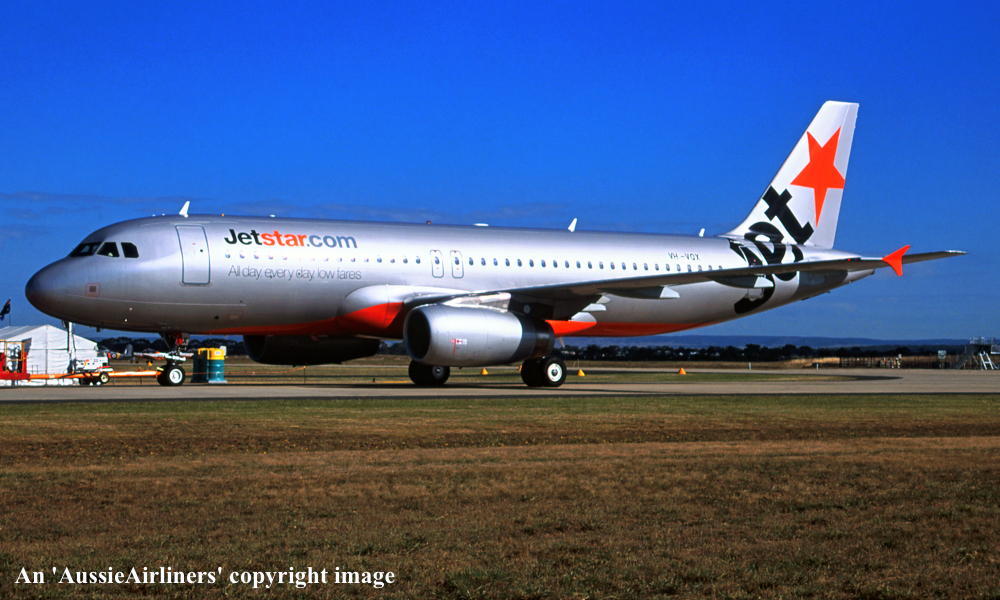 VH-VQX. Jetstar - in the original livery at Melbourne Avalon Airport, date unknown. (R. N. Smith Collection Copyright Image 0321-105.) |
