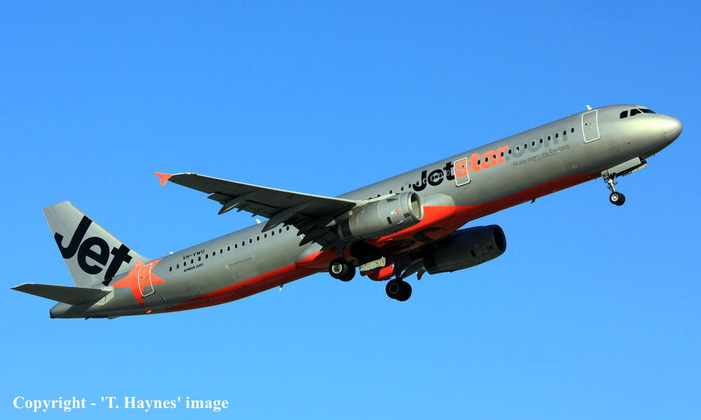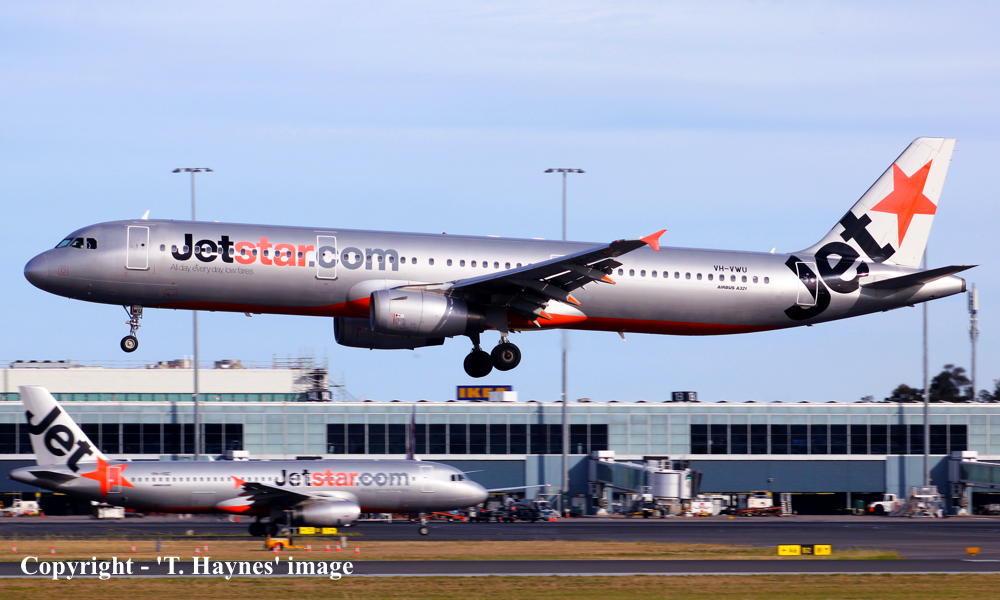 VH-VWU. Jetstar - in the standard livery at Sydney Kingsford Smith Airport, March 29, 2024. (T. Haynes Copyright Image 0321-656.) |