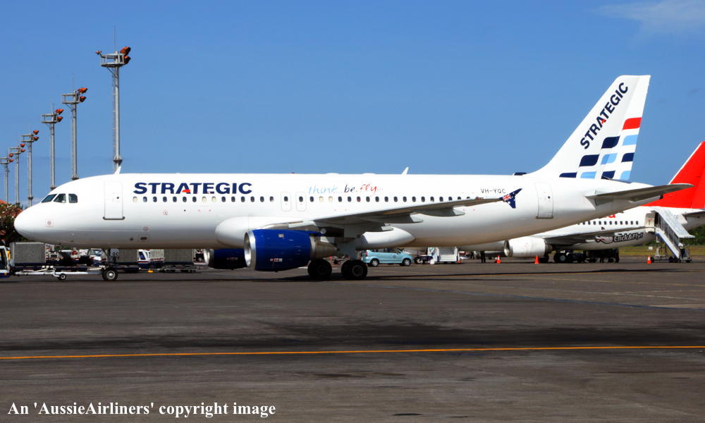 VH-YQC. Strategic - in the standard livery with additional 'think.be.fly' titles at Denpasar Airport, August 16, 2010. (R. Finlayson Copyright Image 0320-291.) |