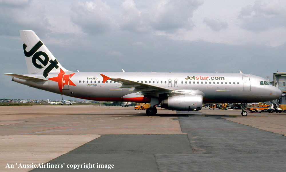 9V-JSD. Jetstar - in the standard livery at an unknown airport, December 2007. (R. N. Smith Collection Copyright Image 0325-009.) |