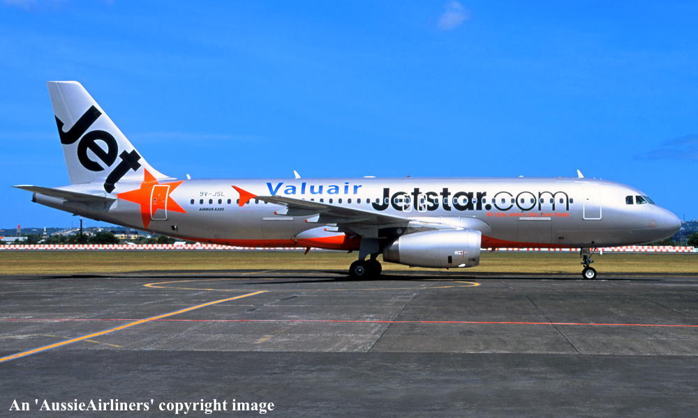 9V-JSL. Jetstar Asia - in the original livery with additional 'Valuair' titles at an unknown airport, date unknown. (R. N. Smith Collection Copyright Image 0325-183.) |