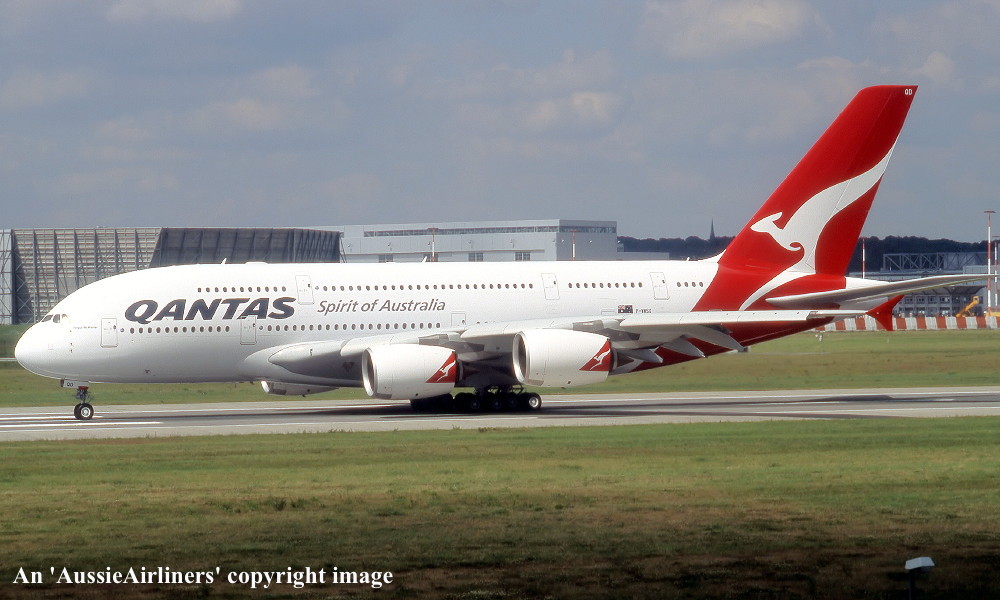 F-WWSX. Qantas Spirit of Australia - 'Fergus McMaster' in the 'New Roo' livery at Hamburg Finkenwerder Airport, August 2009. (R. N. Smith Collection Copyright Image 0380-005.) |