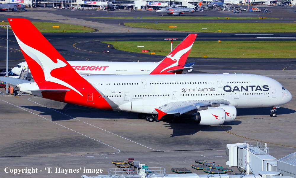 VH-OQD. Qantas Spirit of Australia - 'Fergus McMaster' in the 'New Roo' livery at Sydney Kingsford Smith Airport, March 10, 2014. (T. Haynes Copyright Image 0380-129.) |