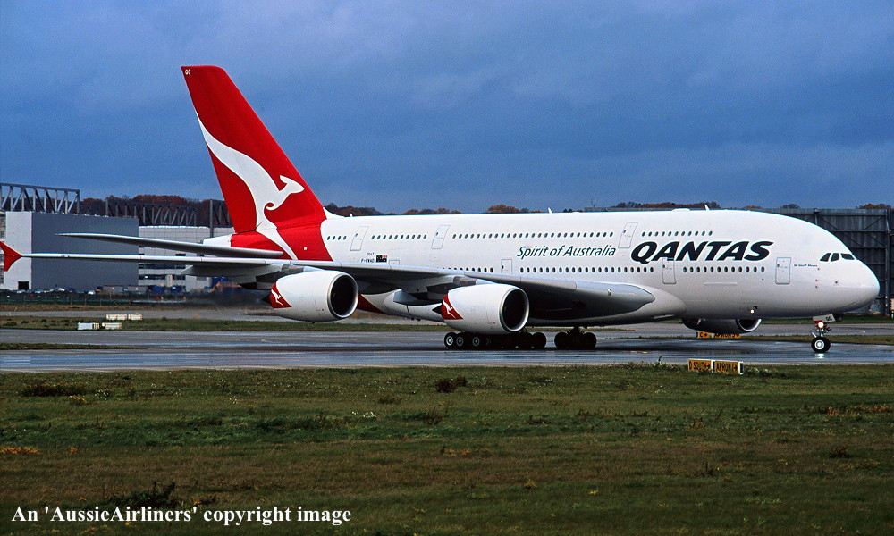 F-WWAD. Qantas Spirit Of Australia - 'Sir Geoff Moore' in the 'New Roo' livery at Hamburg Finkenwerder Airport, October 31, 2010. (R. N. Smith Collection Copyright Image 0380-063.) |