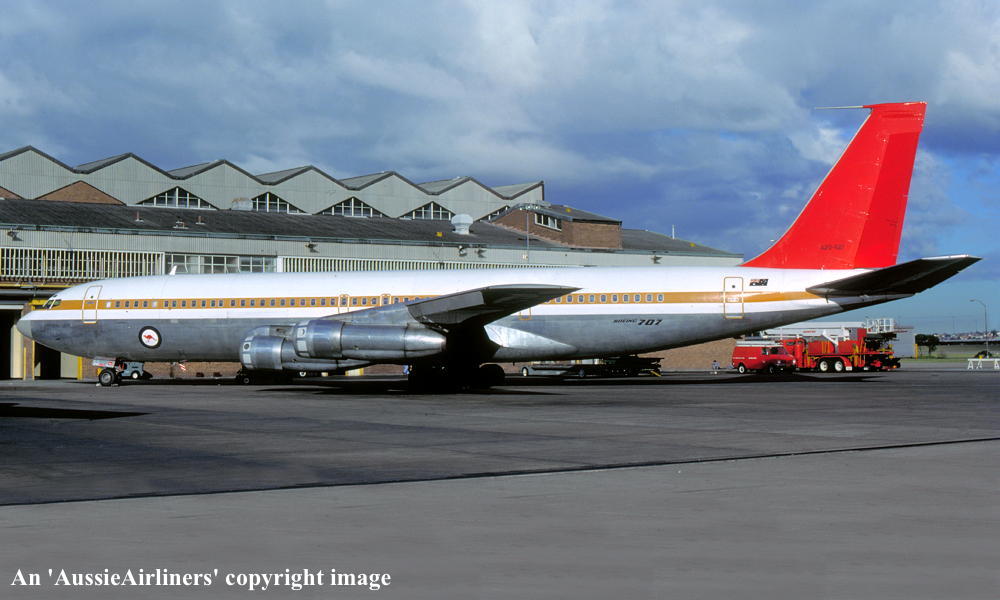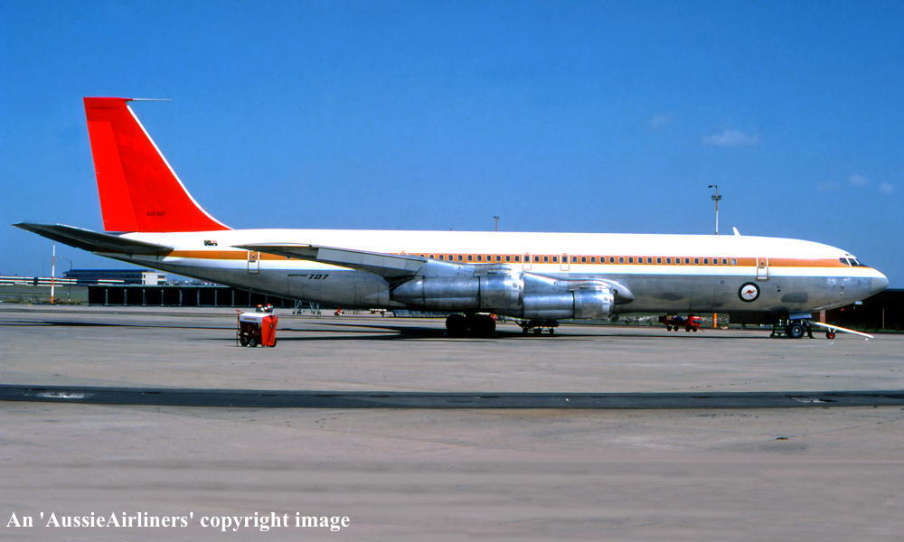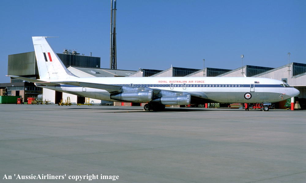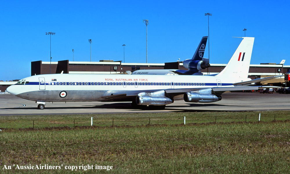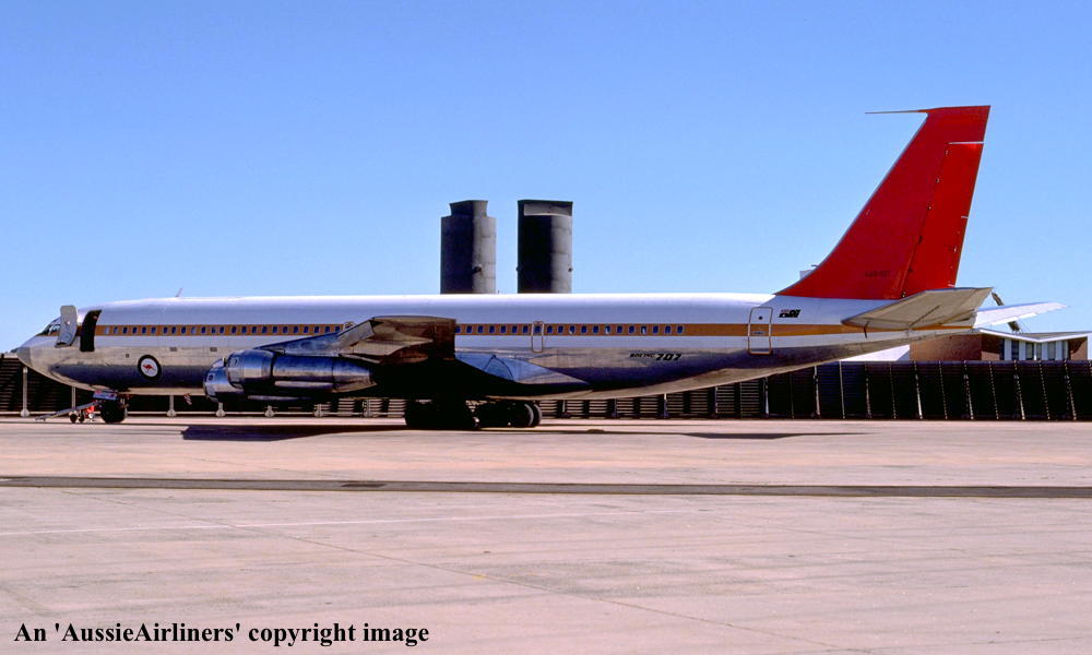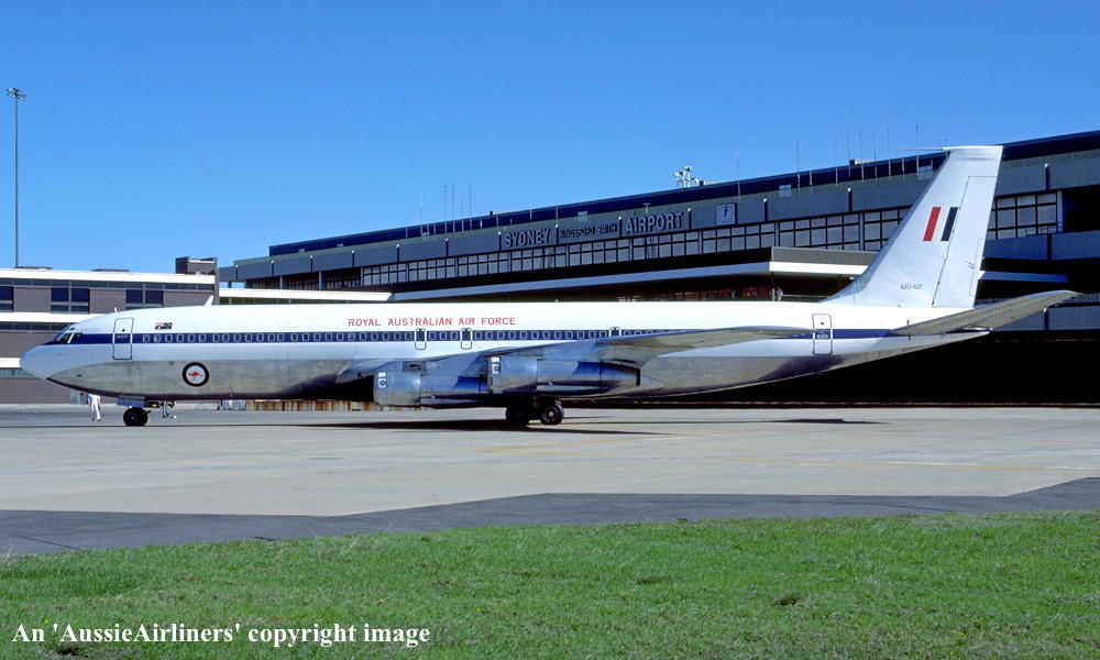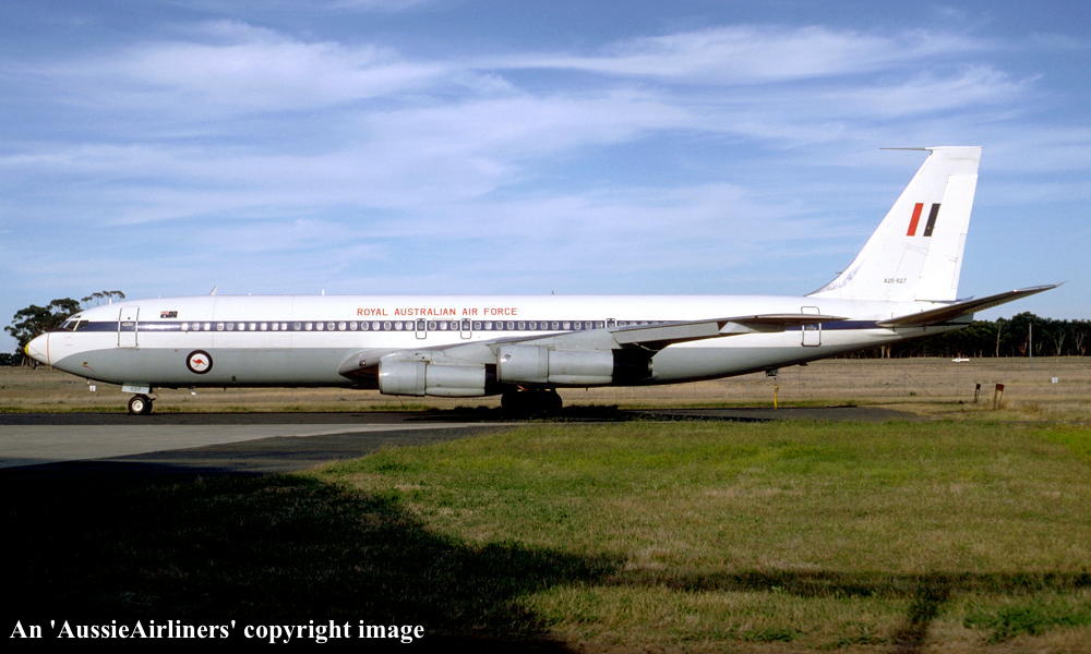 This aircraft was ordered new by Qantas Airways - ? Rolled off the Boeing production line at Seattle (Boeing Field) - April 02, 1968 First flown at Seattle as 'VH-EAG' - April 30, 1968 Entered onto the Australian Aircraft Register as VH-EAG - May 16, 1968 Registered to Qantas Airways Ltd, Sydney Accepted by B. Langevad for Qantas Airways at Seattle (Boeing Field) - May 16, 1968 It was the 31st Boeing airliner delivered new to Qantas Airways The aircraft was named 'City of Hobart' Departed Seattle (Boeing Field) on the delivery to Australia as QF051D - May 16, 1968 It arrived at Sydney (Kingsford Smith - 15:38 local) on completion of the delivery flight - May 18, 1968 Delivery route: Seattle - Honolulu - Sydney Flight crew: Captains C. G. Fox, L.W. Clarke; S/O M. Q. Blackley (HNL-SYD); N/O R. Chivers, W. B. Short (HNL-SYD); F/E E. W. Fargas; Flight Steward R. C. Curley It was the first Boeing 707 to land at Melbourne (Tullamarine) Airport (Captain D. Harden) - June 11, 1968 It conducted publicity and courtesy flights whilst in Melbourne Operated its first revenue service Sydney - Brisbane - Auckland - Sydney - June 23, 1968 It was renamed 'Alice Springs' - February 22, 1974 Utilised on Cyclone Tracey relief flight and evacuated 271 passengers from Darwin - December 27, 1974 Utilised on Cyclone Tracey relief flight and evacuated 226 passengers from Darwin - December 29, 1974 Operated final 707 service Sydney - Brisbane - Port Morseby - Brisbane - Sydney route as QF95/96 - February 2, 1979 It operated an Antarctic Sceninc flight departing Adelaide (West Beach) - February 13, 1979 Operated the last Qantas 707 service on the Sydney - Christchurch - Sydney route - March 24, 1979 Operated the final scheduled Qantas 707 service Sydney - Auckland - Sydney as QF50/51 - March 25, 1979 This flight was under the command of Captains P. Oakley & G. Molloy Conducted a special 1 hour charter flight Sydney - Sydney (Captain J. Blair) - March 25, 1979 Operated an unscheduled service Sydney (Kingsford Smith) - Melbourne (Tullamarine) as QF16 - March 26, 1979 This last revenue flight carried 104 passengers stranded in Sydney by an air traffic controllers strike Operated the final Qantas 707 flight Melbourne (Tullamarine) - Sydney (Kingsford Smith) as QF16P - March 26, 1979 This flight carried 4 passengers and was under the command of Captain A. Wickes Sold to the Royal Australian Air Force Cancelled from the Australian Aircraft Register - March 30, 1979 The aircraft had flown 38,013 hours with 14,498 cycles Handed over to R. A. A. F. in basic Qantas livery with R. A. A. F. roundels at Sydney (Kingsford Smith) - April 07, 1979 Entered onto the Australian Military Aircraft Register as A20-627 Issued to No 33 Squadron for transport duties Repainted into the R. A. A .F. VIP livery ? The aircraft was named 'Windsor Town' Converted to tanker configuration - ? Retired from service and stored at Sydney (RAAF Richmond) - February 21, 2001 The aircraft had flown a total of 50,234 hours of which 12,175 hours were in RAAF service Used as a source of parts for the remaining R. A. A. F. Boeing 707 fleet Intended to be sold to Omega Air, U. S. A. along with the other decommissioned RAAF Boeing 707s It was observed stored at Sydney (RAAF Richmond) - 2009 Scrapped at Sydney (RAAF Richmond) - November 23, 2009 The cockpit section was not scrapped and has been donated to HARS, Wollongong, N.S.W. for display |