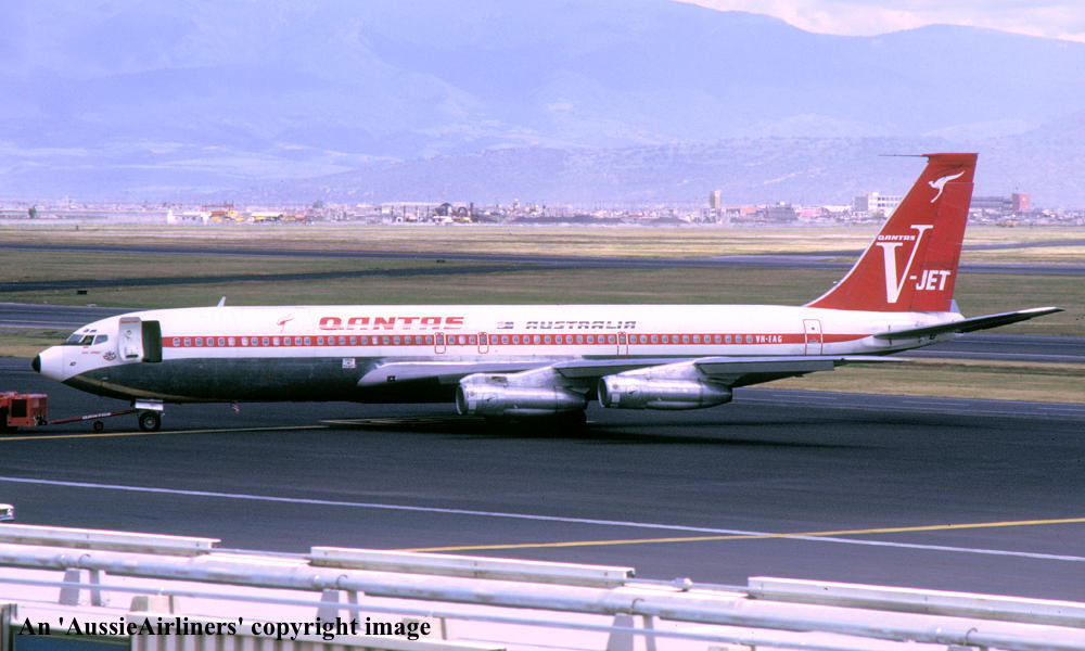 VH-EAG. Qantas Australia - 'City of Hobart' in the revised 'V-Jet' livery at Mexico City Airport, September 1972. (R. N. Smith Collection Copyright Image 4604-138.) |