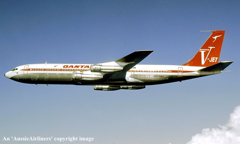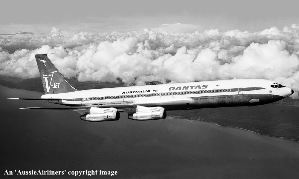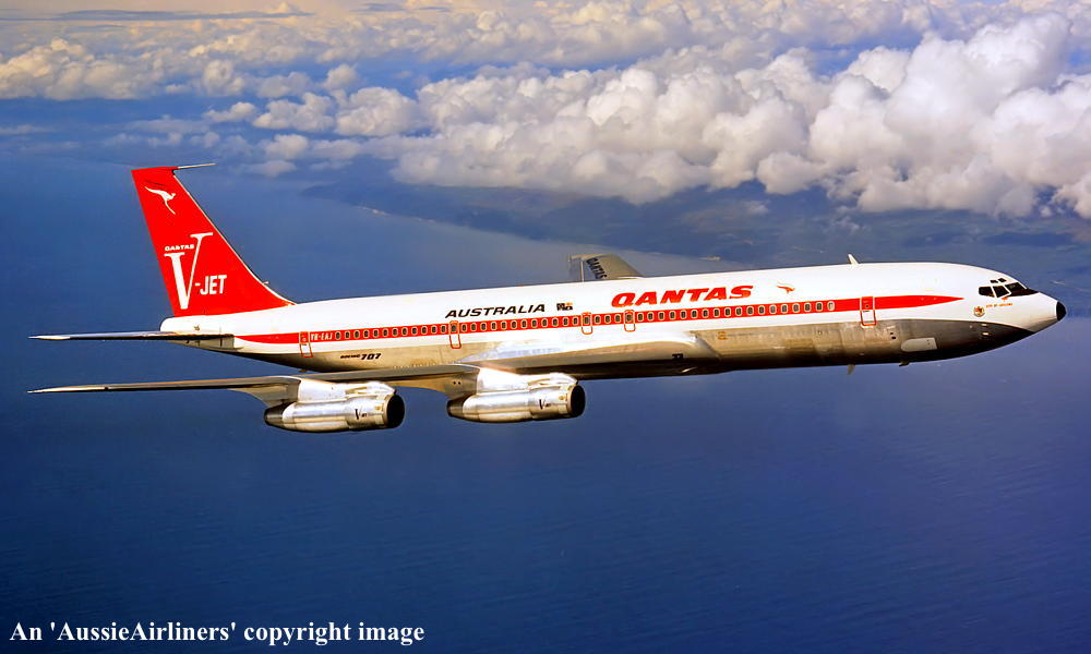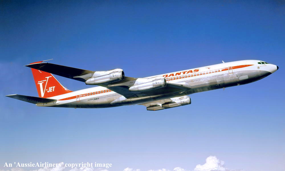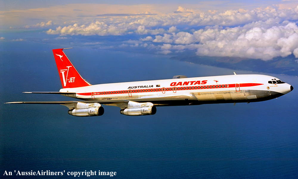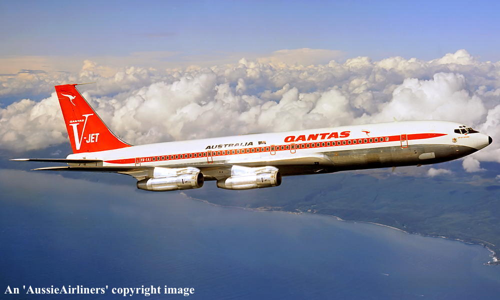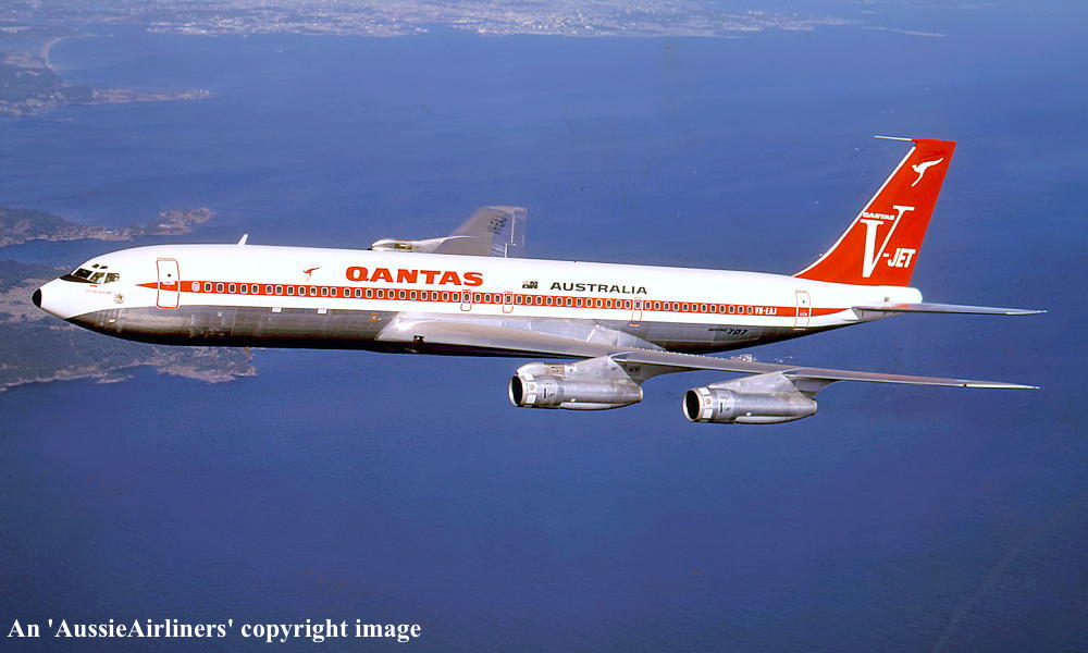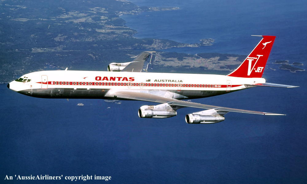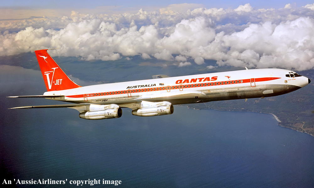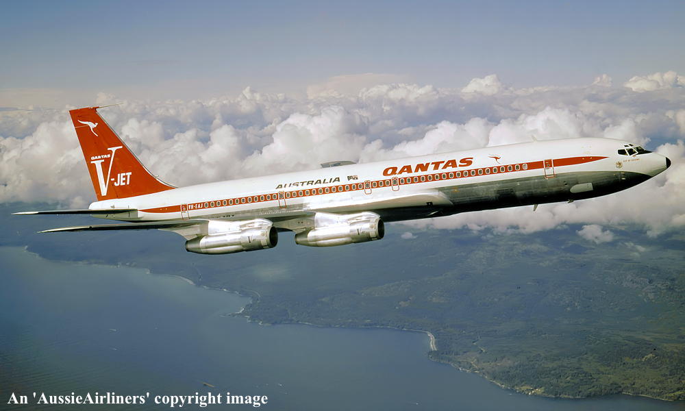 VH-EAJ. Qantas Australia - 'City of Geelong' in the 'V-jet' livery over Washington State, September 1968. (Qantas Heritage Collection Copyright Image 4605-036.) |