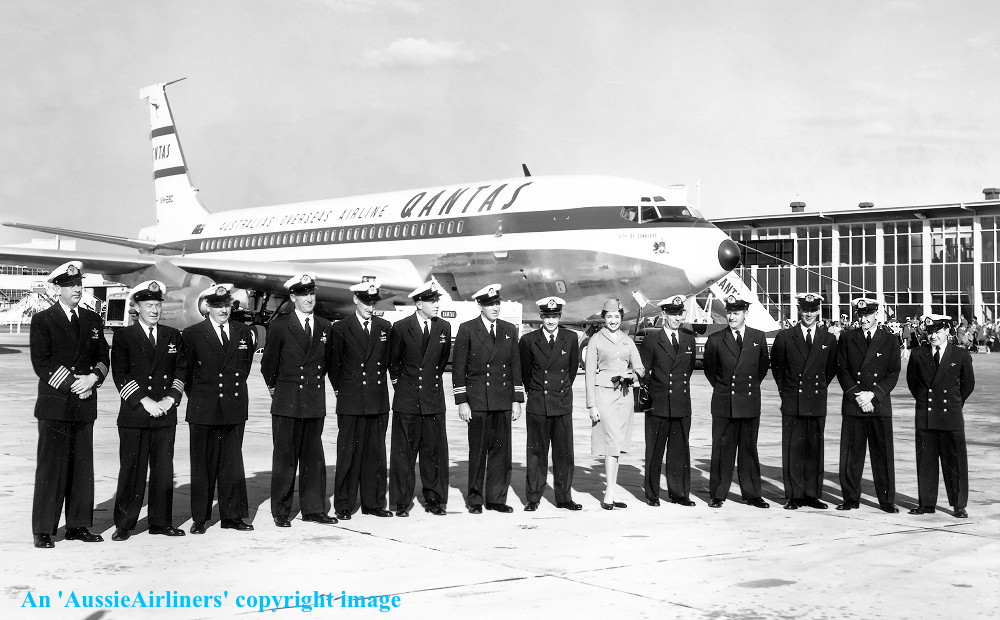 VH-EBC. Qantas Australia's Overseas Airline - 'City Of Canberra' in the original livery at Sydney Kingsford Smith Airport, July 29, 1959. From L to R: Captain I Ralfe; Captain R. Uren; Captain F. Fox; Navigator R. G. Goodwin; Navigator Patterson; F/O E. R. Robinson; F/O K. McKnight; F/E D. Morehouse; Flight Hostess B.Burke; Flight Steward H. Smith; Flight Steward unknown; Flight Steward B. Slatter; Flight Steward unknown; Flight Steward unknown. (Qantas Heritage Collection Copyright Image 4604-713.) |