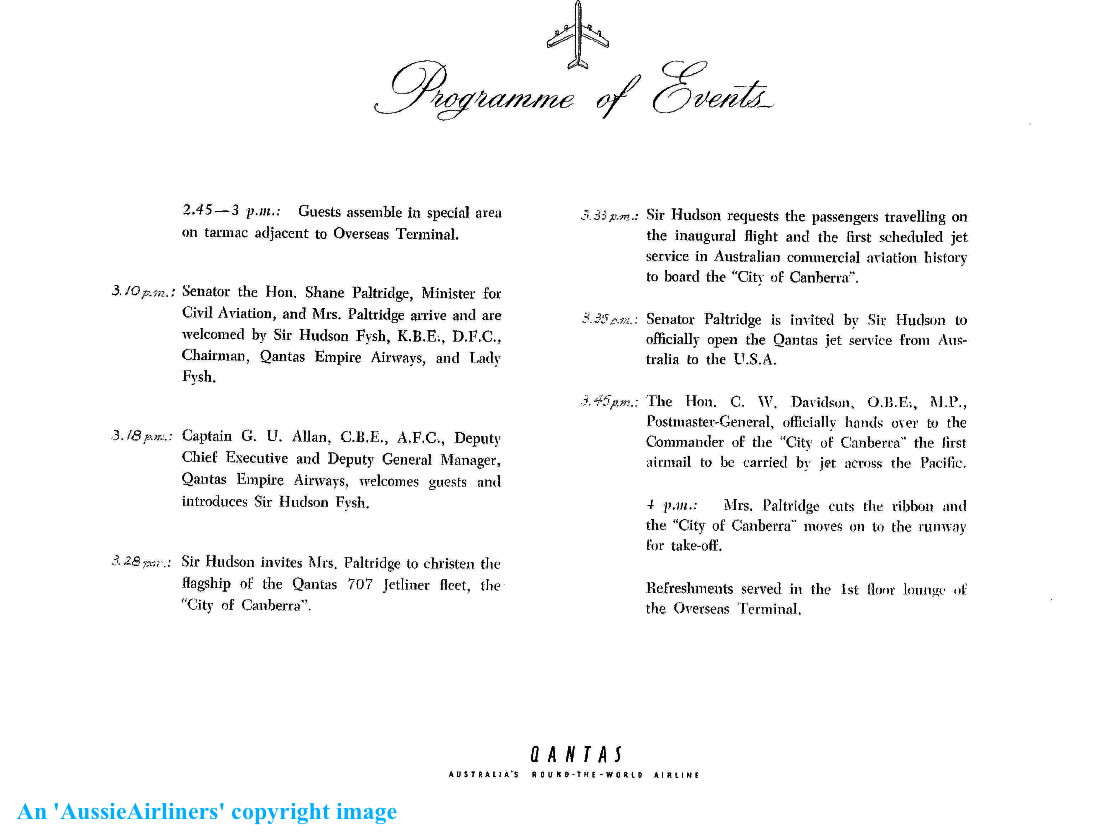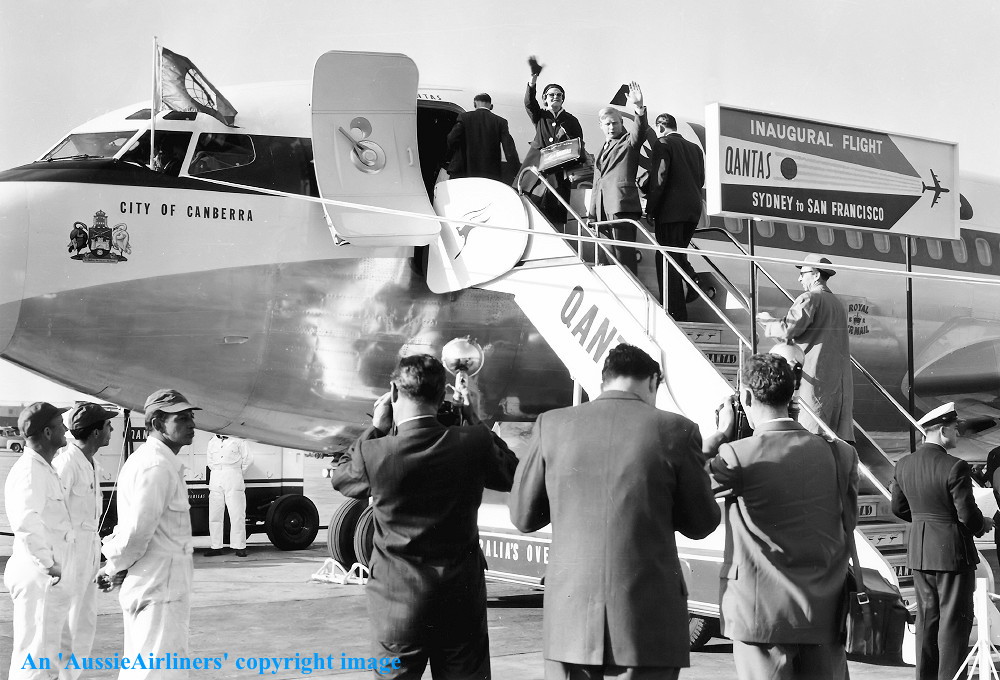 Qantas Memorandum CRA: 0660/9018 - The Qantas 707 Jets Are Coming - to read please click 'HERE' This aircraft was ordered new by Qantas Empire Airways - ? Rolled off the Boeing production line at Renton as a 707-138 - April 27, 1959 First flown as 'VH-EBC' - June 08, 1959 Powered by Pratt & Whitney JT3C-6 turbojet engines with 13,500 lb thrust Entered onto the Australian Aircraft Register as VH-EBC - July 06, 1959 Registered to Qantas Empire Airways Ltd, Sydney Accepted by J. Mills at Seattle (Boeing Field) on behalf of Qantas Airways - July 06, 1959 This was the 2nd Boeing airliner to be delivered to Qantas Airways The aircraft was originally named 'City of Melbourne' Departed Seattle (Boeing Field) on the delivery flight to Australia - July 07, 1959 It arrived at Sydney (Kingsford Smith - 16:38 local) on completion of the delivery flight - July 09, 1959 On arrival at Sydney the Number 4 engine pod struck the ground during the landing Delivery route: Seattle - San Francisco - Honolulu - Nadi - Sydney The aircraft was renamed 'City of Canberra' before the inaugural passenger flight Departed Sydney (Kingsford Smith) on the inaugural Qantas 707 service as EM775 - July 29, 1959 Inaugural service Sydney - Nadi - Honolulu - San Francisco set a commercial record of 14 hours 57 minutes Flight crew: Captain I. D. V. Ralfe; F/O Captain R. F. Uren; S/O Captain C. G. Fox; Navigator R. G. Goodwin; F/O K. D. Stark; Flight Stewards H. Smith, J. Brown, B. Slater, G. Sweeney, E. Duker; Hostess E. Wright; Supernumerary crew: F/O J. P. Theobald; N/O R. R. Sherwin; E/O D. S. Moorhouse Departed Sydney on a proving flight to London via the Kangaroo Route - October 19 to October 24, 1959 Departed Sydney on return to Boeing for conversion to 707-138B standard - September 29, 1961 Re-engined with Pratt & Whitney JT3D-1 turbofan engines with 17,500 lbs thrust Returned to Qantas on completion of the conversion - November 08, 1961 Departed Seattle on the ferry flight to Sydney (Kingsford Smith) - November 09, 1961 It arrived at Sydney (Kingsford Smith) on completion of the ferry flight - November 11, 1961 Ferry route: Seattle - San Francisco - Honolulu - Nadi - Sydney Entered Block C overhaul where fin & rudder were repainted in 'V-Jet' livery - November 17, 1961 Rolled out at Sydney (Kingsford Smith) in new 'V-Jet' livery - December 17, 1961 The aircraft was used in the 'Malta Airlift' - January 1963 This was the first Boeing 707 to land at Malta For further information about the 'Malta Airlift' please click 'HERE' Operated the inaugural Sydney (Kingsford Smith) - London (Heathrow) service via Kuala Lumpur - September 04, 1965 Operated its final revenue service Sydney - London - Sydney via the Kangaroo Route - January 29, 1967 Cancelled from the Australian Aircraft Register - March 21, 1967 Aircraft had flown 23,213 hours with 10,842 cycles Sold to Seymour R. Gross, Chicago, USA - April 1, 1967 Entered onto the United States Aircraft Register as N791SA - April 1967 Leased to Standard Airways, USA - April 01, 1967 Departed Sydney (Kingsford Smith) on the delivery flight to Standard Airways - April 04, 1967 Leased to Sudflug, Germany for northern summer - May 1967 Leased to Canadian Pacific Airways in the standard CPA livery - October 01, 1967 The aircraft was named 'Empress of Sydney' This aircraft was destroyed when it over-ran the runway on landing in fog at Vancouver Airport - February 07, 1968 It crashed into an airport building, killing 2 and injuring 18 The remains were sold to a North Carolina aircraft salvage company Aircraft had flown a total of 26,712:00 hours To read the Canadian Department of Transport report on this accident please click 'HERE' |