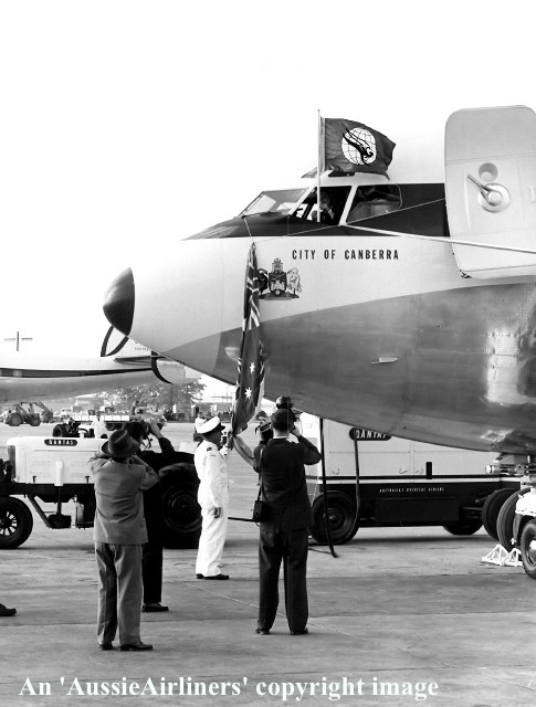 VH-EBC. Qantas Australia's Overseas Airline - 'City Of Canberra' in the original livery at Sydney Kingsford Smith Airport, July 29, 1959. (Qantas Heritage Collection Copyright Image 4604-794.) |