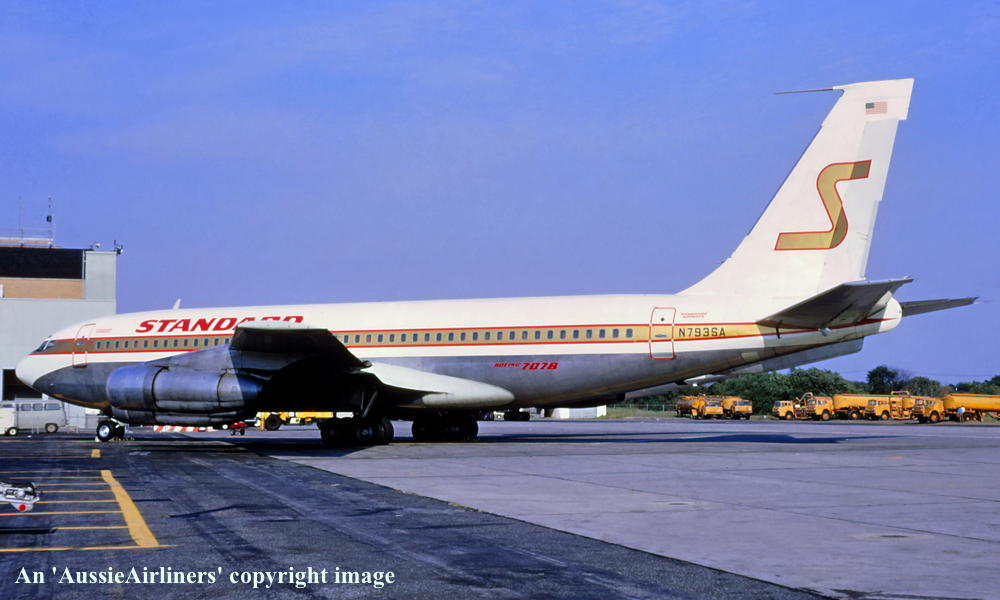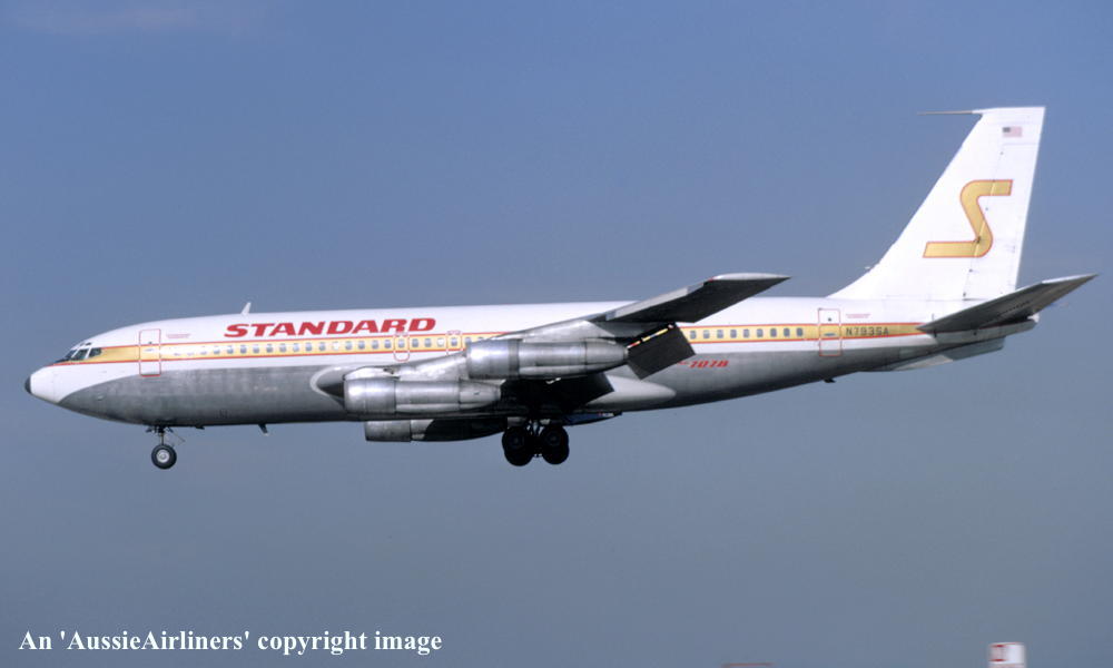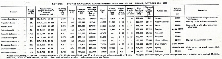Established a flight record San Francisco - New York of 4 hours 33 minutes - June 01, 1960 Flight crew: Captain A. A. E. Yates, M. Bamman, L. Richardson; F/O R. S. Bee, W. Court; F/E G. Bacon Departed Sydney (Kingsford Smith) with the Australian Olympic Team for Rome - August 18, 1960 Departed Sydney (Kingsford Smith) on return to Boeing for conversion to 707-138B standard - October 18, 1961 Accepted by Qantas at completion of the conversion at Seattle - November 30, 1961 It arrived at Sydney (Kingsford Smith) on completion of the ferry flight - December 04, 1961 The new 'V-Jet' livery was applied to the fin and rudder at Sydney (Kingsford Smith) - December 05 - 07, 1961 Returned to service Sydney (Kingsford Smith) - London (Heathrow) via Kangaroo Route - December 08, 1961 Operated the inaugural Sydney (Kingsford Smith) - Perth - London (Heathrow) service - February 01, 1962 Operated the first direct Brisbane - Singapore service - April 06, 1962 Positioned Sydney (Kingsford Smith) - Christchurch for Royal Tour taking 2 hours 19 minutes - February 17, 1963 This was the first Boeing 707 to visit New Zealand Departed Christchurch for Sydney with HRH Queen Elizabeth II and Prince Phillip - February 18, 1963 It was operated as the official aircraft for the Royal Tour Established a record flight time on the Sydney (Kingsford Smith) - Brisbane route of 46 minutes - July 19, 1963 Departed Sydney (Kingsford Smith - 15:00 local) on its final revenue service - February 16, 1968 Route: Sydney - San Francisco - Sydney Withdrawn from use and stored at Sydney (Kingsford Smith) - February 1968 Cancelled from the Australian Aircraft Register - May 01, 1968 The aircraft had flown 26,203 hours to date Sold to International Aerodyne for lease to Standard Airways - May 15, 1968 Entered onto the United States Aircraft Register as N793SA - May 1968 Departed Sydney (Kingsford Smith) at 11:15 local on the ferry flight to United States - May 15, 1968 Leased to Pacific Western Airlines - July 20, 1969 Entered onto the Canadian Aircraft Register as CF-PWW - July 20, 1969 Returned to Standard Airways at the end of the lease - May 01, 1971 Cancelled from the Canadian Aircraft Register - May 01, 1971 Entered onto the United States Aircraft Register as N793SA - May 01, 1971 Leased to Alaska Airlines - May 01 to September 30, 1971 Leased to Bahamas World Airlines - November 18, 1971 Cancelled from the United States Aircraft Register - November 18, 1971 Entered onto the Bermuda Aircraft Register as VP-BDE - November 18, 1971 Returned to Standard Airways at the end of this lease - August 08, 1974 Sold to National Aircraft Leasing - August 08, 1974 Cancelled from the Bermuda Aircraft Register - ? Entered onto United States Aircraft Register as N793NA - ? Leased to Aero America - October 1975 Sub-leased to Egyptair - February to April, 1976 Sub-leased to Egyptair - June to October 1977 Withdrawn from use and stored at Seattle (Boeing Field) - February 1978 Sold to TAG Air - January 20, 1979 Sold to Boeing for spares for use in the KC-135 refurbishment program - April 24, 1983 Registered to Aviation Technical Support Inc, Waco, Texas - June 1983 Cancelled from the United States Aircraft Register - July 1983 Dismantled by National Aircraft at Tucson, Arizona - 1996 Parts used by company doing structural testing and fuel probe / wiring modifications - circa 2003 The remaining airframe was scrapped at Tucson - March 2006 |