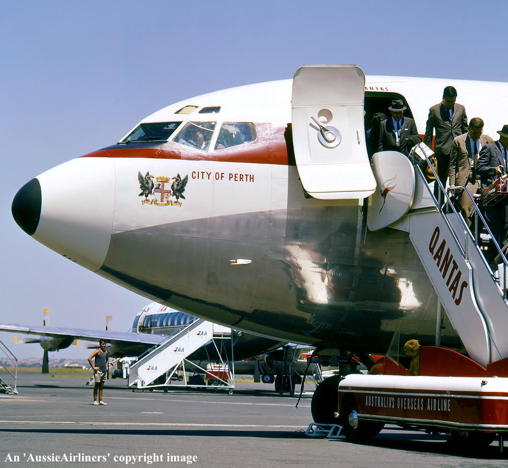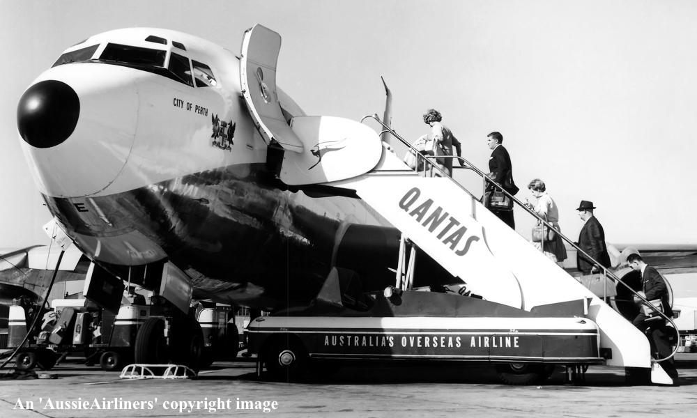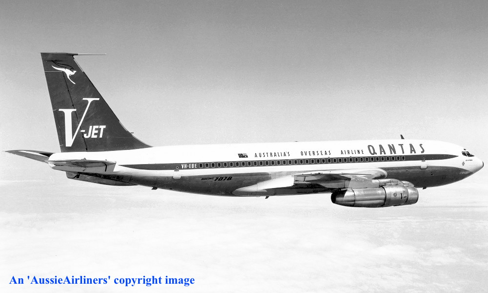 This was the fifth of seven Boeing 707-138s ordered new by Qantas Empire Airways Ltd - 1958 It rolled off the Boeing production line at Renton as a Boeing 707-138 - July 02, 1959 First flown - August 13, 1959 Accepted by L. Leishman for Qantas Empire Airways at Seattle - August 24, 1959 This was the 5th Boeing airliner delivered new to Qantas Airways Entered onto the Australian Aircraft Register as VH-EBE - September 04, 1959 Registered to Qantas Empire Airways Ltd, Sydney Departed Seattle (Boeing Field) on the delivery flight to Australia - September 16, 1959 It arrived at Sydney (Kingsford Smith - 07:19 local) on completion of the delivery flight - September 17, 1959 The aircraft was observed at Melbourne (Avalon) without a name or city 'Coat of Arms' - September 1959 The aircraft was named 'City of Perth' Departed Sydney (Kingsford Smith - 09:00 local) on proving flight to London via the Middle East - October 09, 1959 It arrived at Sydney (Kingsford Smith - 08:00 local) having completed the London proving flight - October 24, 1959 Operated the inuagural Sydney (Kingsford Smith) - London (Heathrow) service via Kangaroo Route - October 27, 1959 It departed Sydney (Kingsford Smith - 13:10 local) under the command of Captain R. Bruce Route: Sydney - Darwin - Singapore - Bangkok - Calcutta - Karachi - Bahrain - Cairo - Rome - London