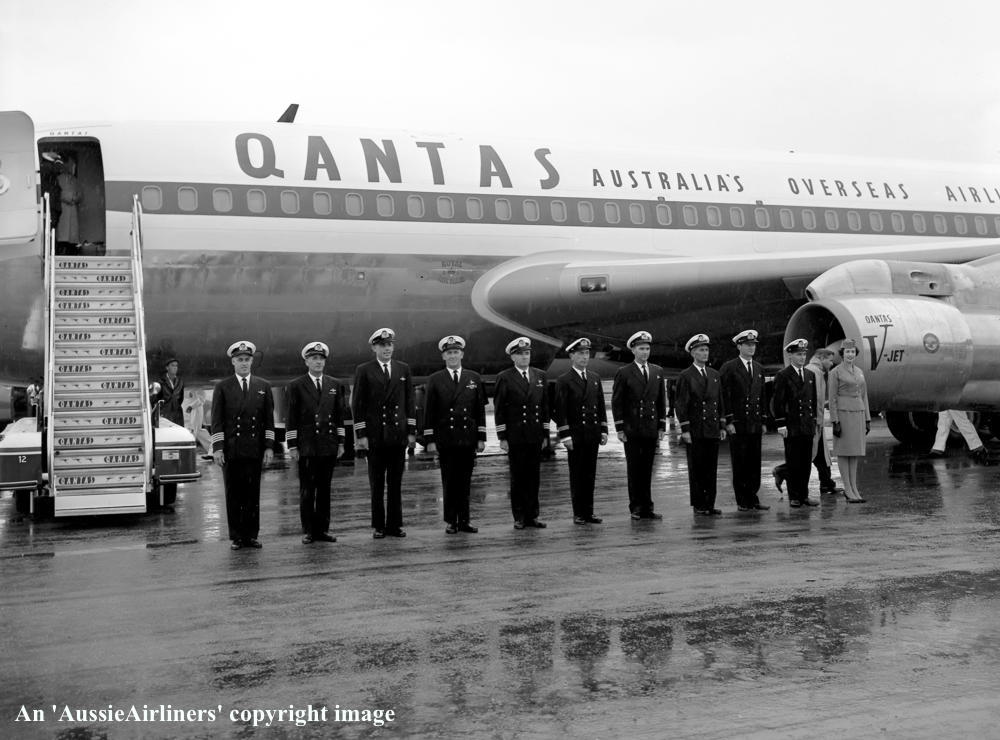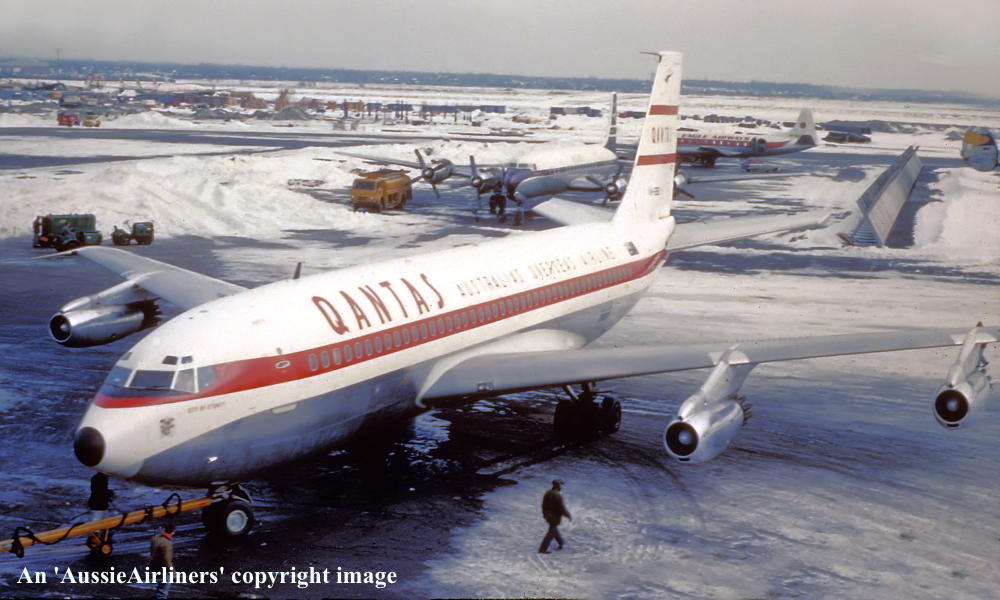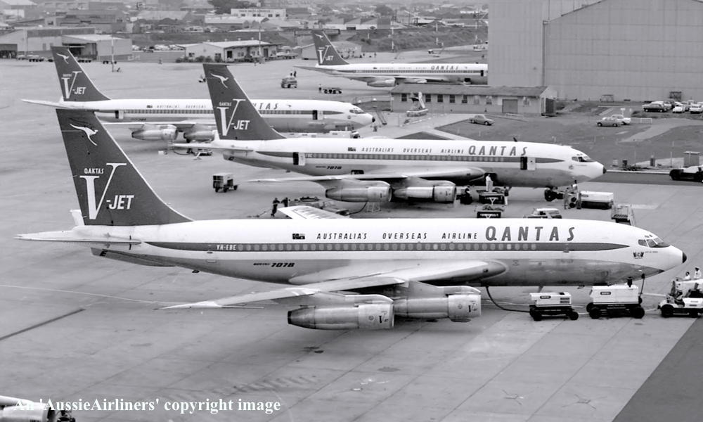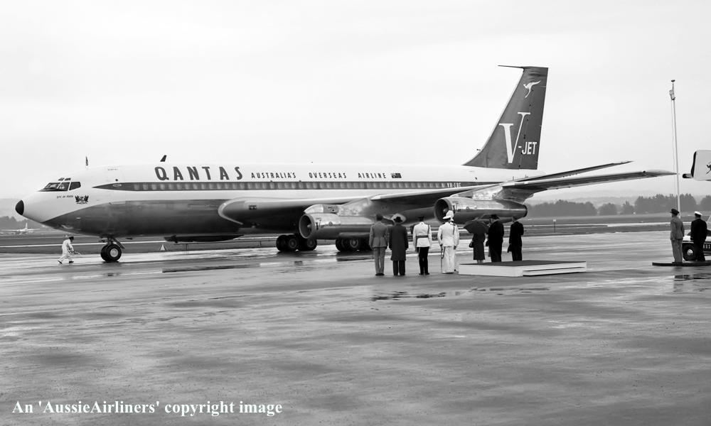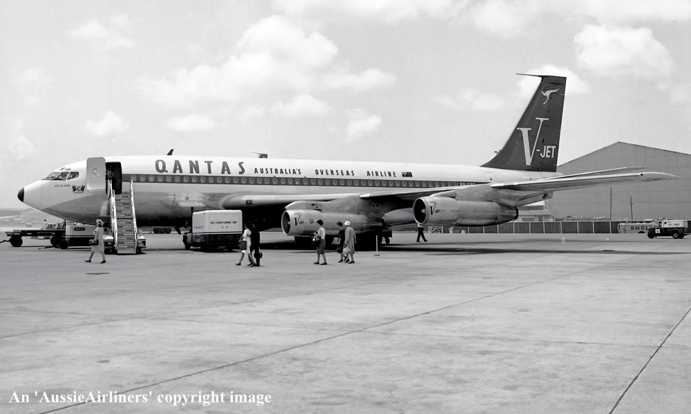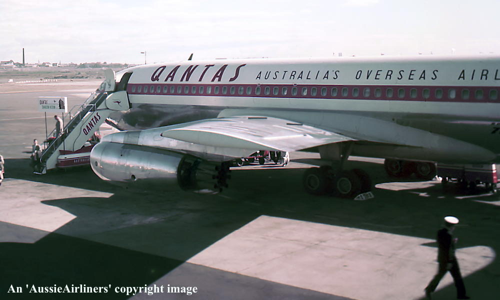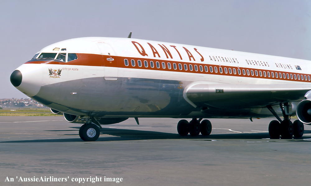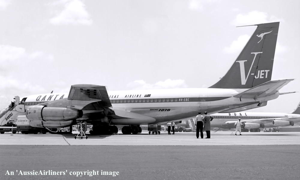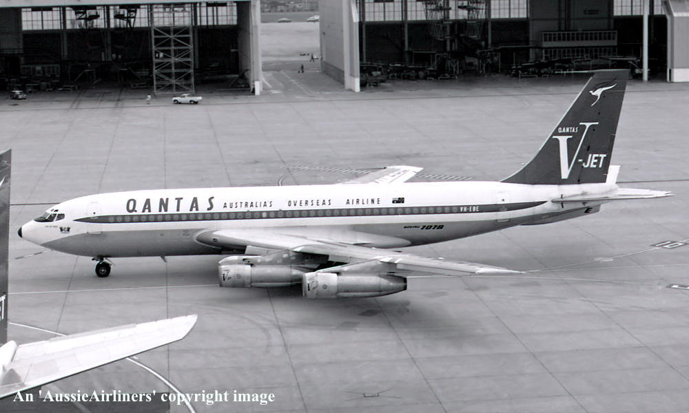 VH-EBE. Qantas Australia's Overseas Airline - 'City of Perth' in the 'V-Jet' livery at Sydney Kingsford Smith Airport, February 1963. (Qantas Heritage Collection Copyright Image 4604-870.) |