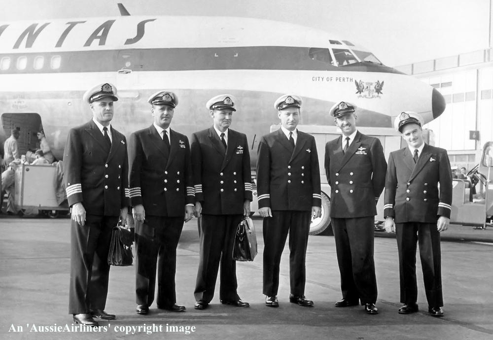VH-EBE. Qantas Australia's Overseas Airline - 'City of Perth' in the original livery at New York Airport, June 01, 1960. The Qantas crew at New York having set a record flight time from San Francisco to New York of 4 hours 33 minutes. From left to right: Captain A. A. E. Yates; Captain M. Bamman; Captain L. Richardson; F/O R. S. Bee; F/O W. Court; F/E G. Bacon. (Qantas Heritage Collection Copyright Image 4604-792.) |