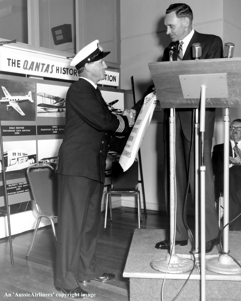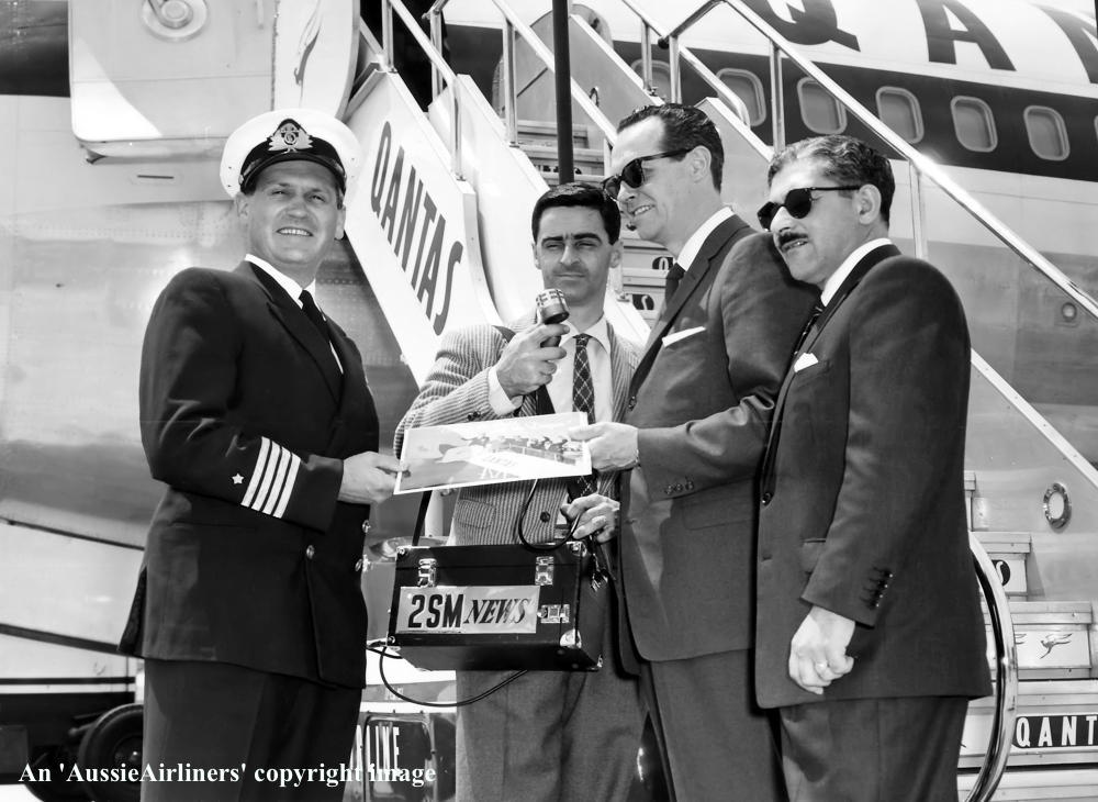 VH-EBE. Qantas Australia's Overseas Airline - 'City of Perth' in the original livery at Sydney Kingsford Smith Airport, October 27, 1959. Captain Ralph Bruce is interviewed by Des Morne and Horrie Dargie from Radio Station '2SM' prior to the inaugural Sydney - London 'Kangaroo' route service. (Qantas Heritage Collection Copyright Image 4604-868.) |