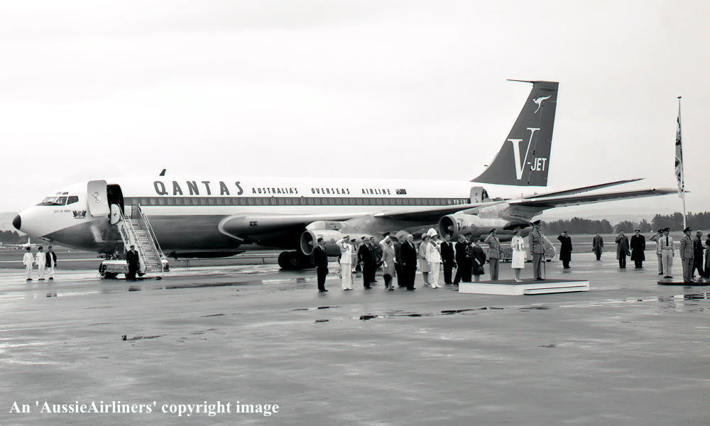VH-EBE. Qantas Australia's Overseas Airline - 'City of Perth' in the 'V-Jet' livery at Canberra Airport, February 1963. The Queen takes the Royal Salute. (Qantas Heritage Collection Copyright Image 4605-182.) |